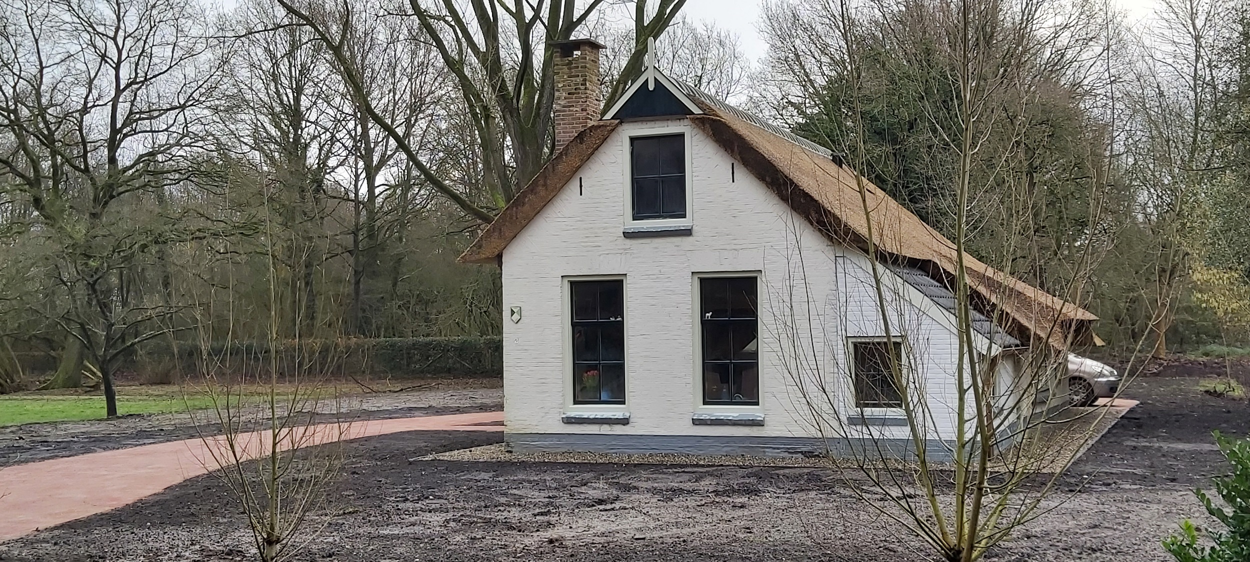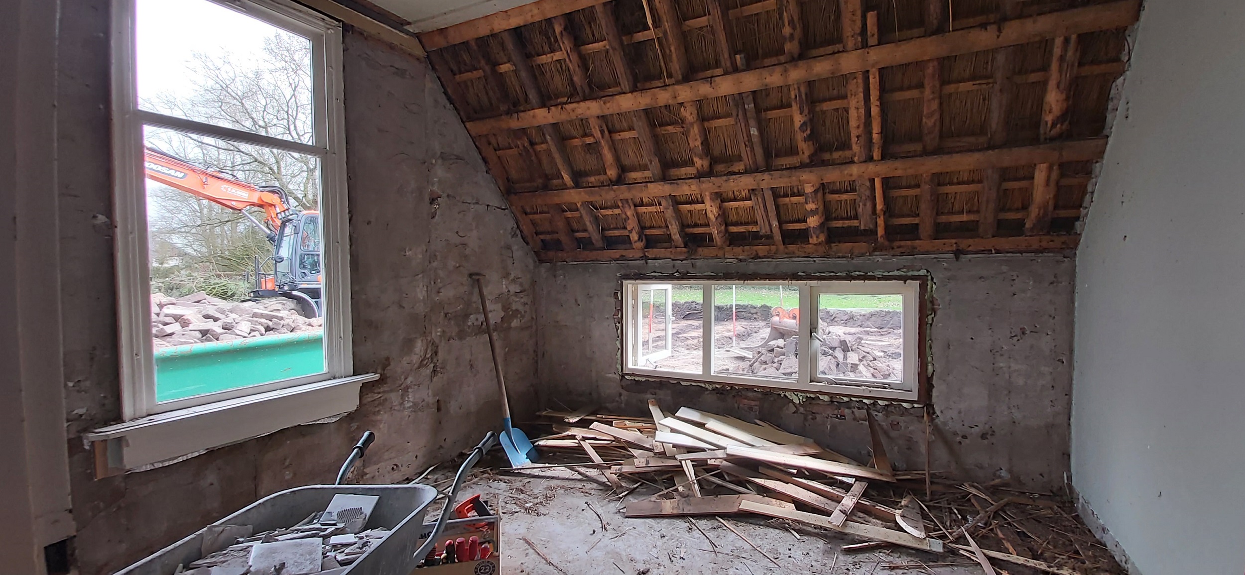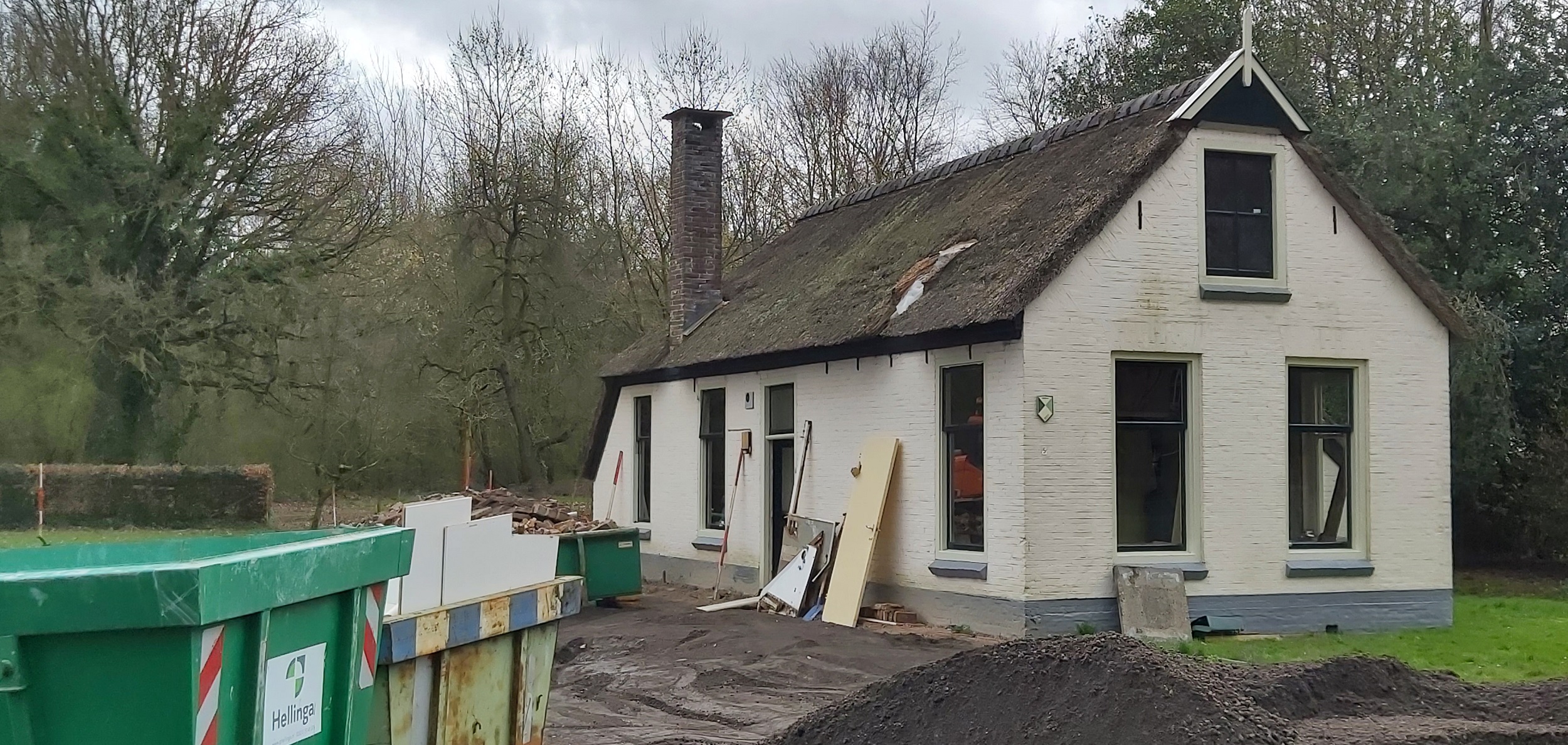 Na een grote renovatie en restauratie wordt deze oude koloniewoning in Frederiksoord weer bewoond. De monumentale koloniewoning was flink verouderd en hebben we grotendeels gestript. De betimmering onder de ramen in de woonkamer had nog de oude juten bekleding, met daarover kranten en het behang. We hebben de fundering afgegraven en de binnenmuren van de hal en de keuken verwijderd.