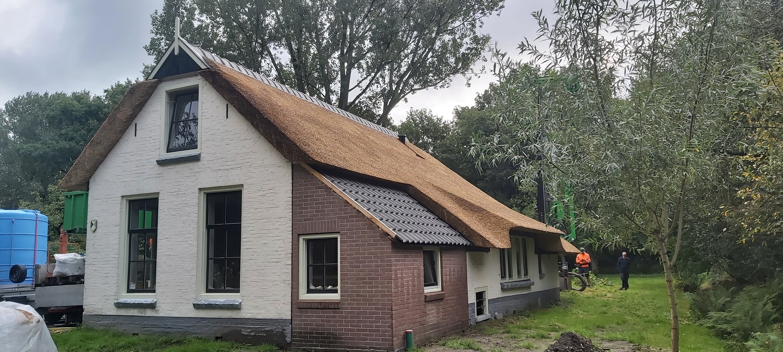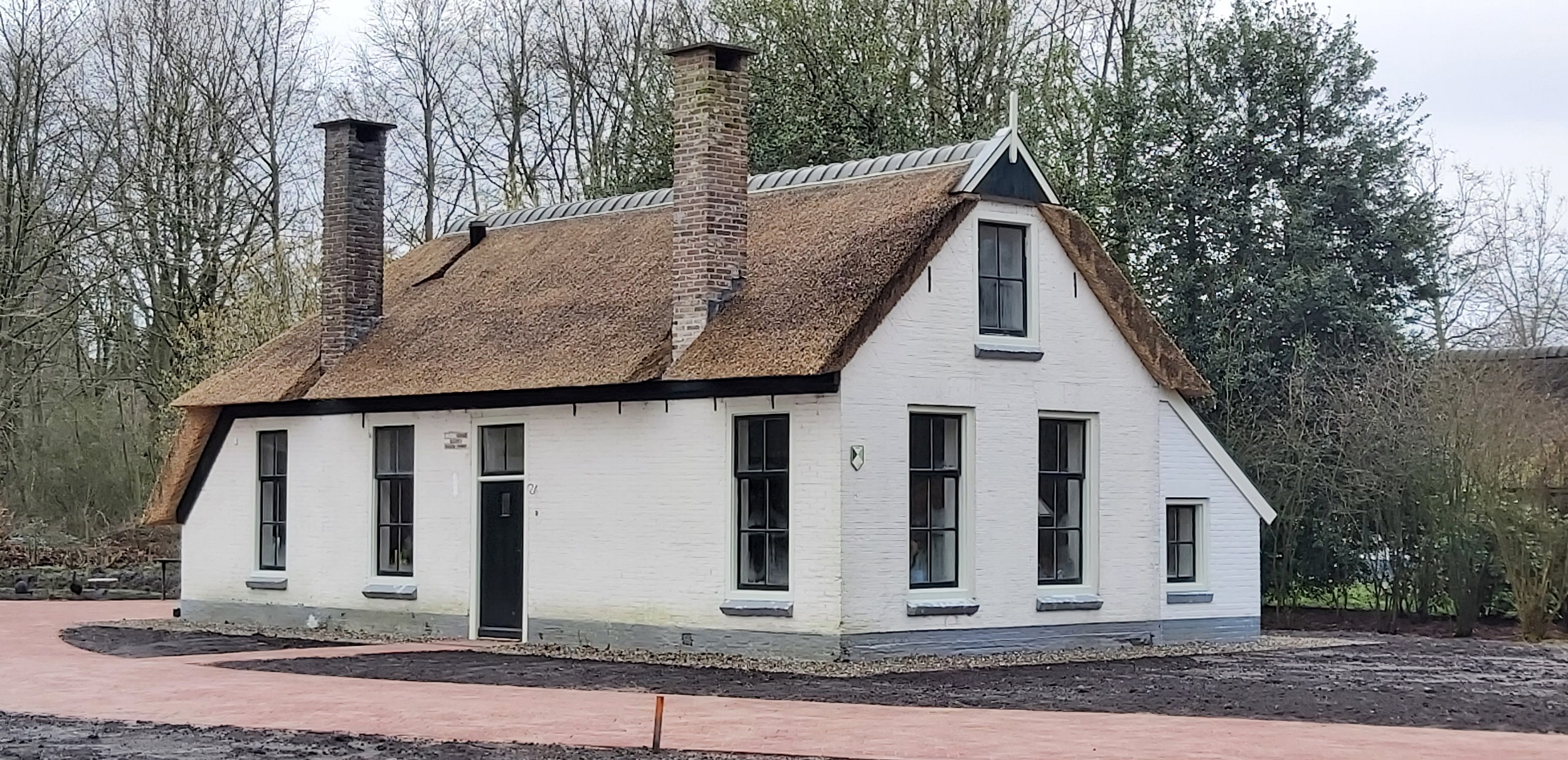 De koloniewoning is nu volledig geïsoleerd. De indeling is deels gelijk gebleven. In de woonkamer is de voormalige bedstee boven de kelder nog zichtbaar. De originele binnendeuren zijn teruggeplaatst evenals een deel van de inbouwkasten. Plafond- en deurlijsten zijn teruggeplaatst en/of nagemaakt. De woonkamer is ruimer, omdat we de woning aan de voorkant hebben verbreed in originele staat. De zolder met twee kamers is bereikbaar via de originele trap en is volledig geïsoleerd. De koloniewoning heeft een nieuwe rieten kap gekregen.