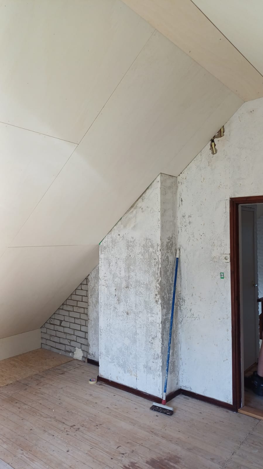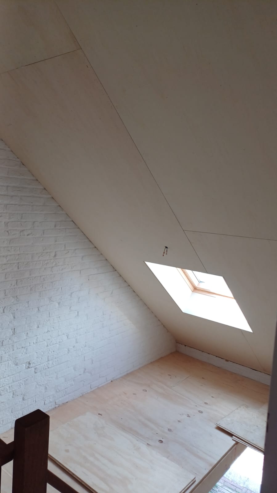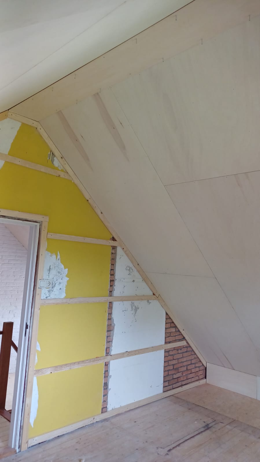 In deze bestaande woning in Tuk hebben we de kap van binnenuit geïsoleerd. Op de verdiepingsvloer hebben we de schuine wanden geïsoleerd. Het dak is afgetimmerd met populieren multiplex platen.