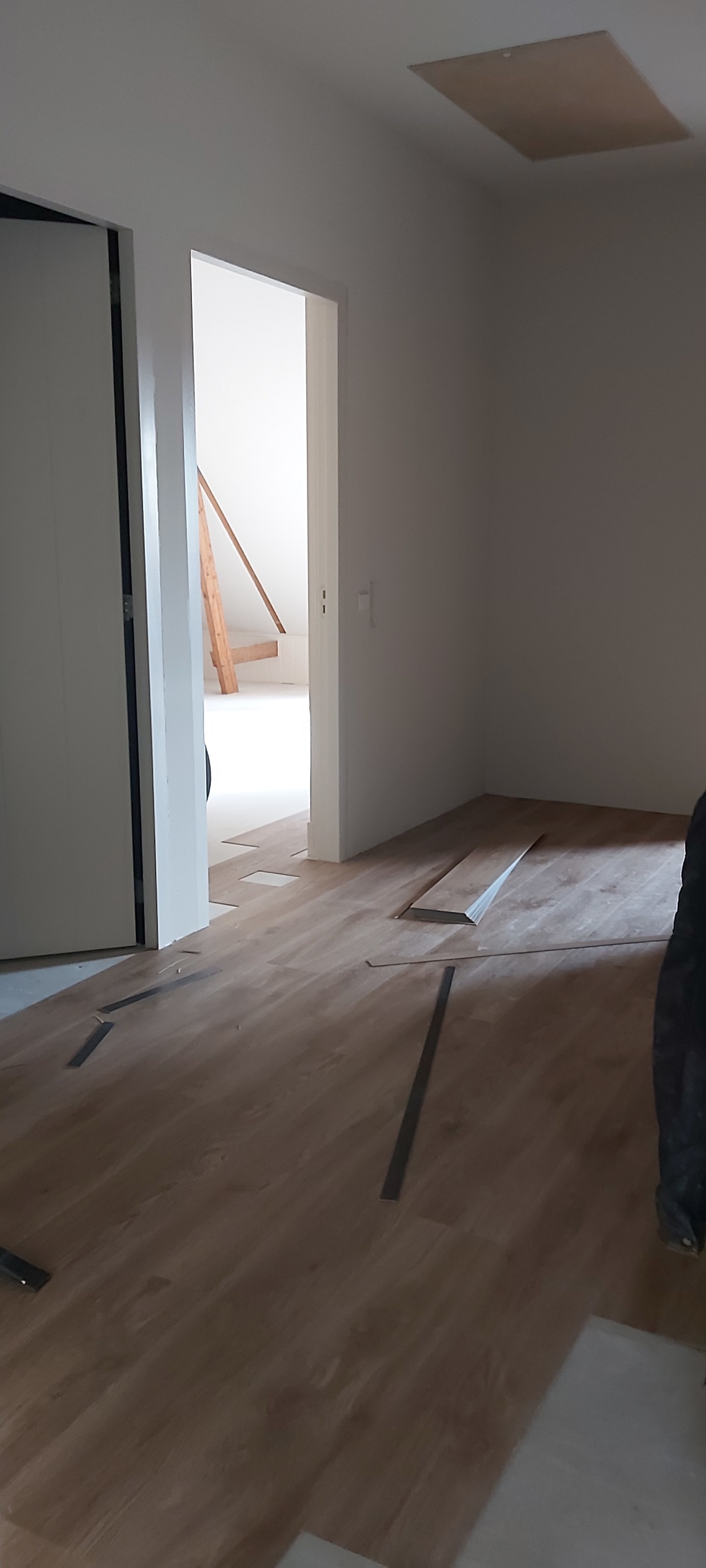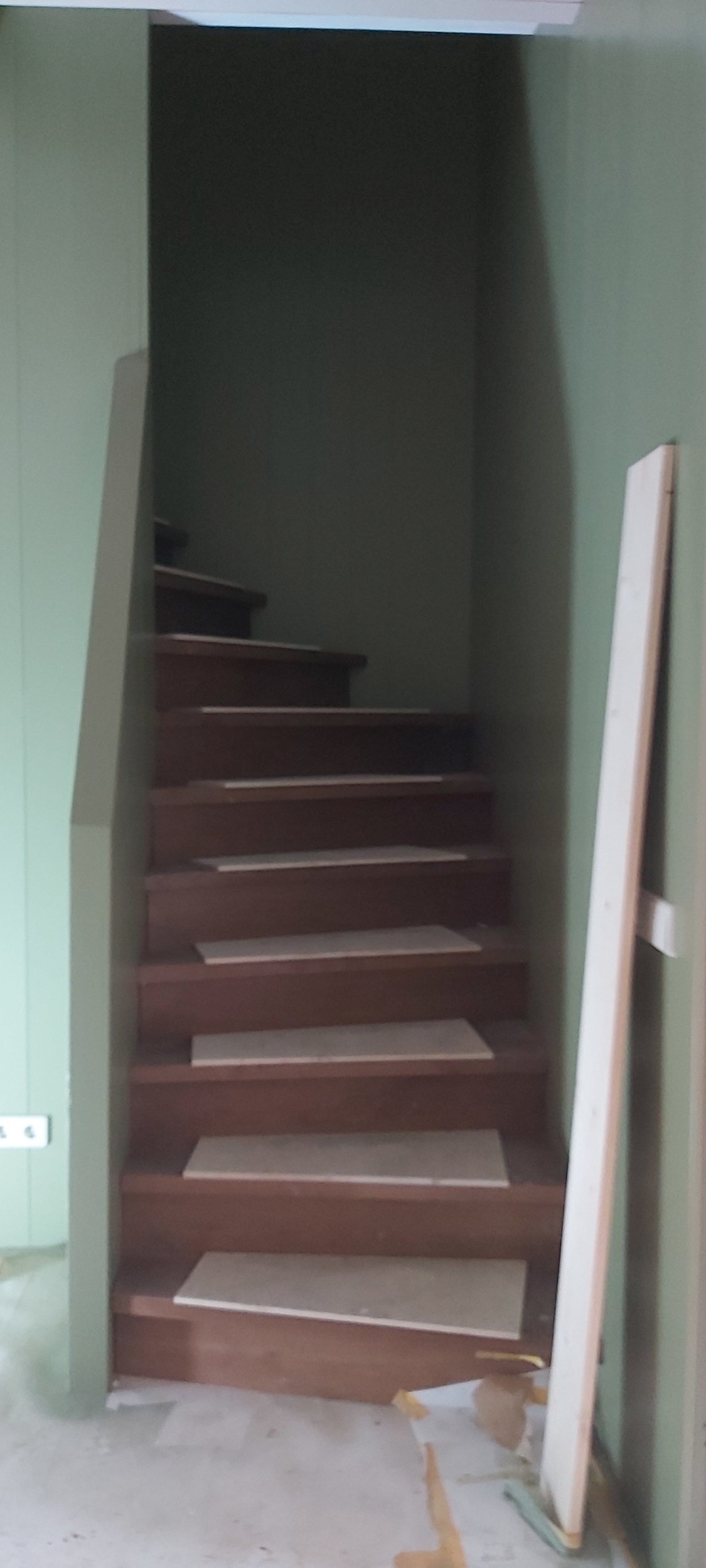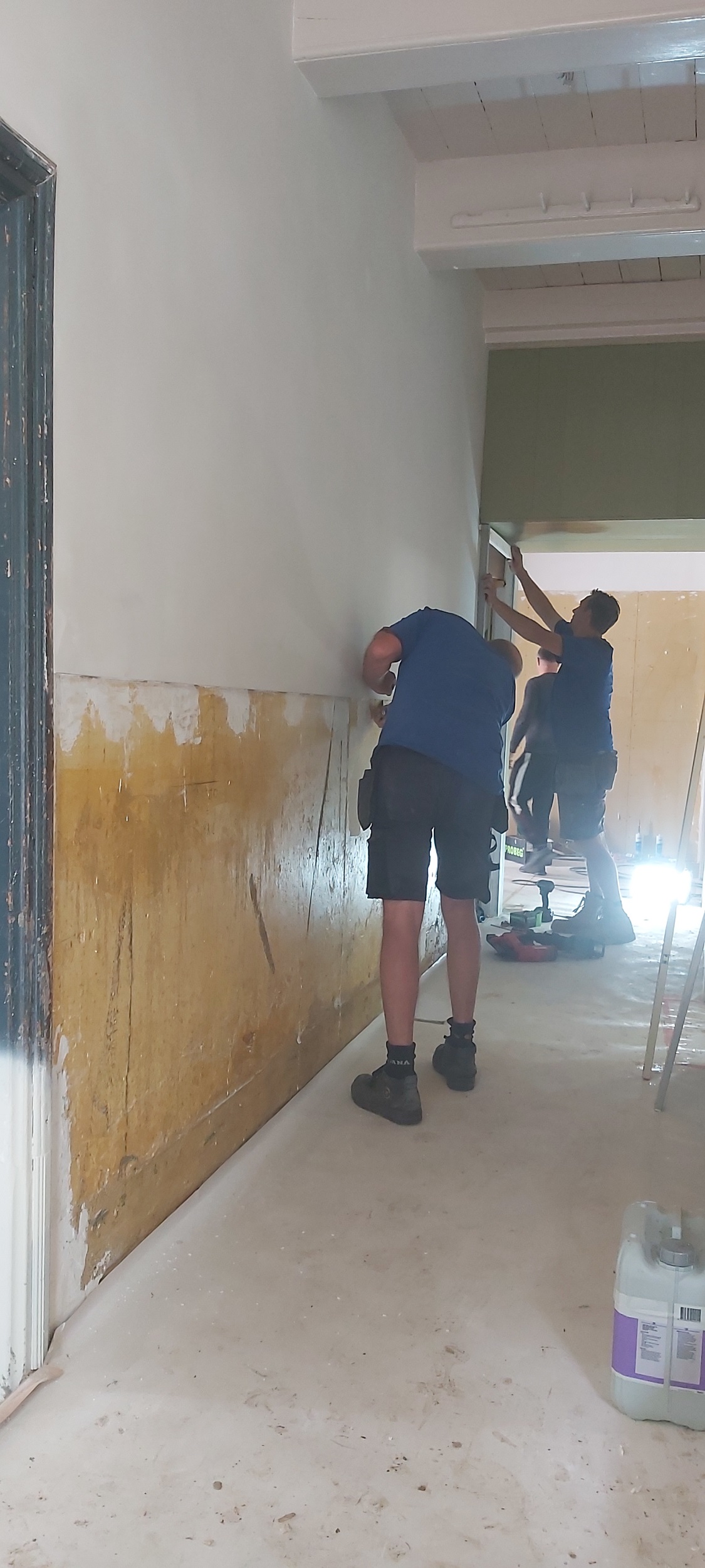 In de monumentale boerderij in Havelte is de schuimbetonvloer gestort en ligt er overal vloerverwarming. In de grote kamer met de bedsteden leggen we de originele estrikenvloer later weer terug. De gebakken tegels zijn schoongemaakt en liggen veilig opgestapeld in grote kisten, totdat ze gelegd kunnen worden. In de keuken komen brede houtlook tegels, zeer geschikt voor vloerverwarming: de tegels houden de warmte langer vast en het blijft langer koel. De gang wordt voorbereid op een nieuwe lambrisering. De bovenverdieping is inmiddels bereikbaar via de nieuwe houten trap. Boven zijn alle slaapkamers geschilderd, de badkamers getegeld en wordt er gewerkt aan het leggen van de vloer.