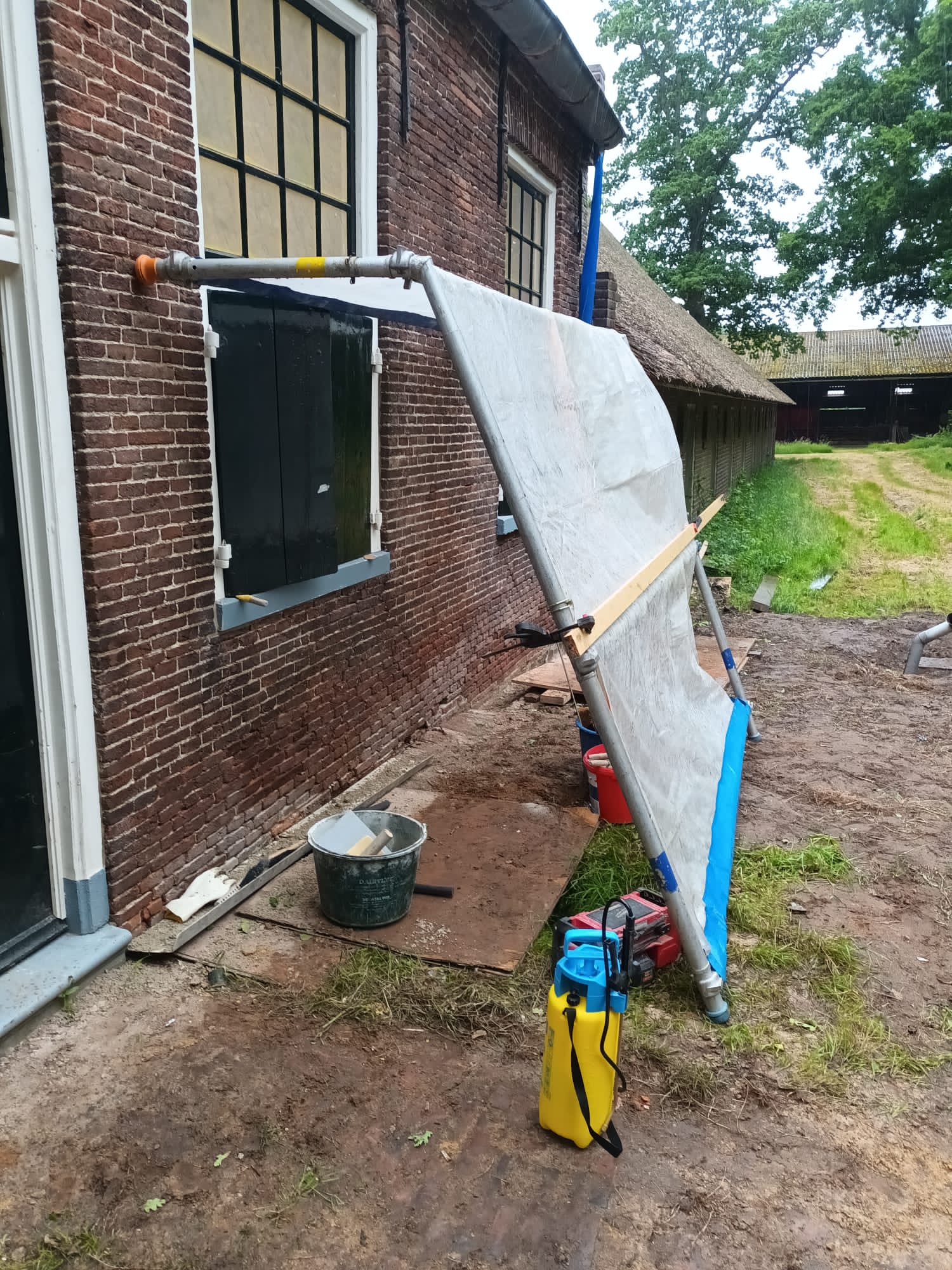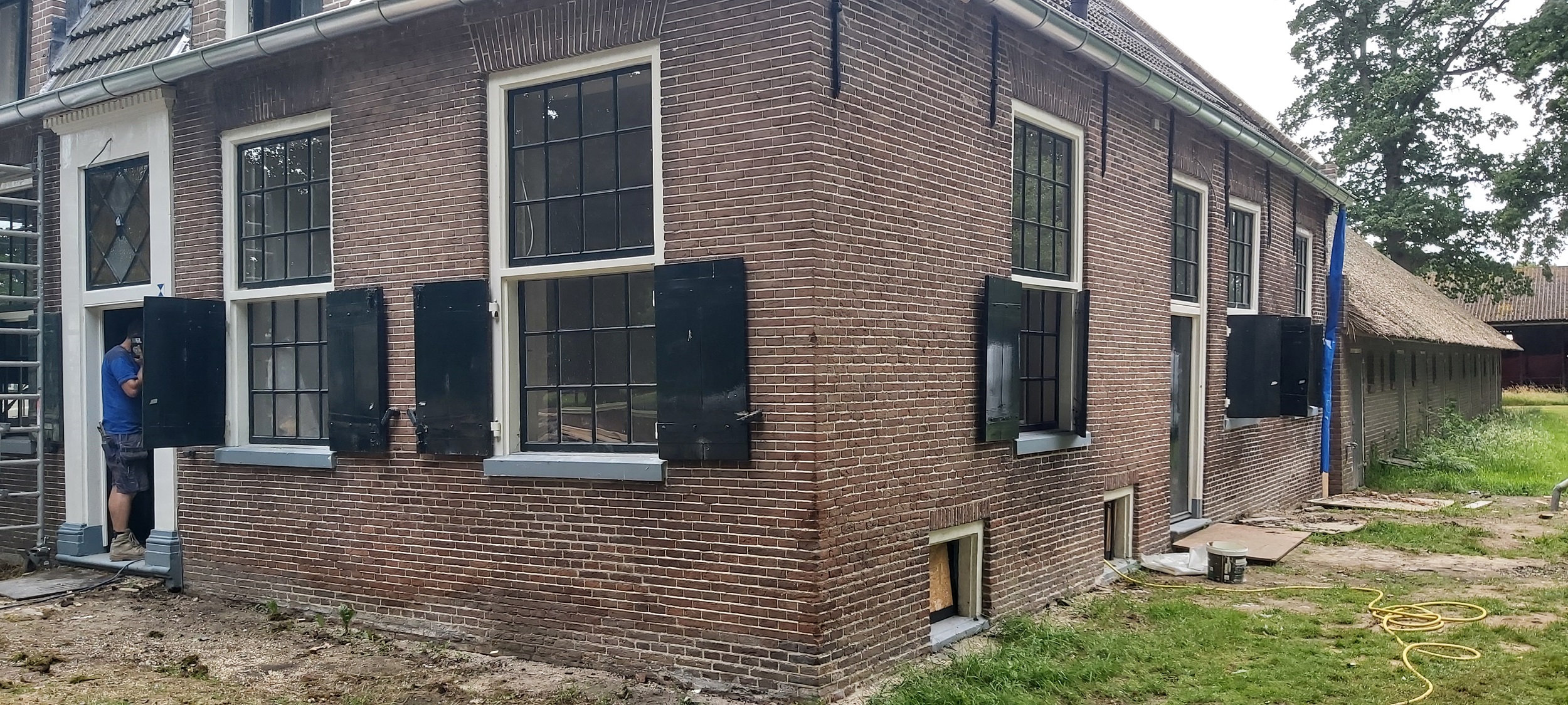 De restauratie van de schoorsteen en gevels is uitgevoerd door Van Milt restaurateurs. De buitenmuren zijn opnieuw gevoegd met kalkspecie. Hiermee voldoen we aan de monumentale eisen om geen cement te gebruiken. Op verschillende plekken in de boerderij zijn de oude kachels verwijderd. De gaten voor de uitvoer zijn allemaal gedicht met de oude stenen en kalkspecie. De schoorsteen vertoonde scheuren en is op dezelfde manier gerestaureerd. Ook de natuursteenplaat op de schoorsteen is gerestaureerd. In de schuur hebben we muurankers gevonden die weer teruggeplaatst zijn. Verroeste muurankers in de muur hebben we uitgebikt, de roest verwijderd en opnieuw teruggeplaatst.