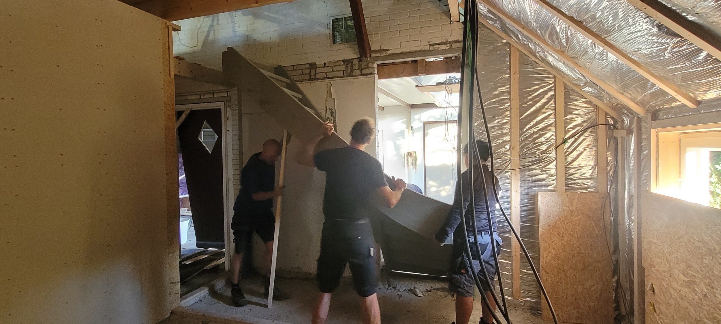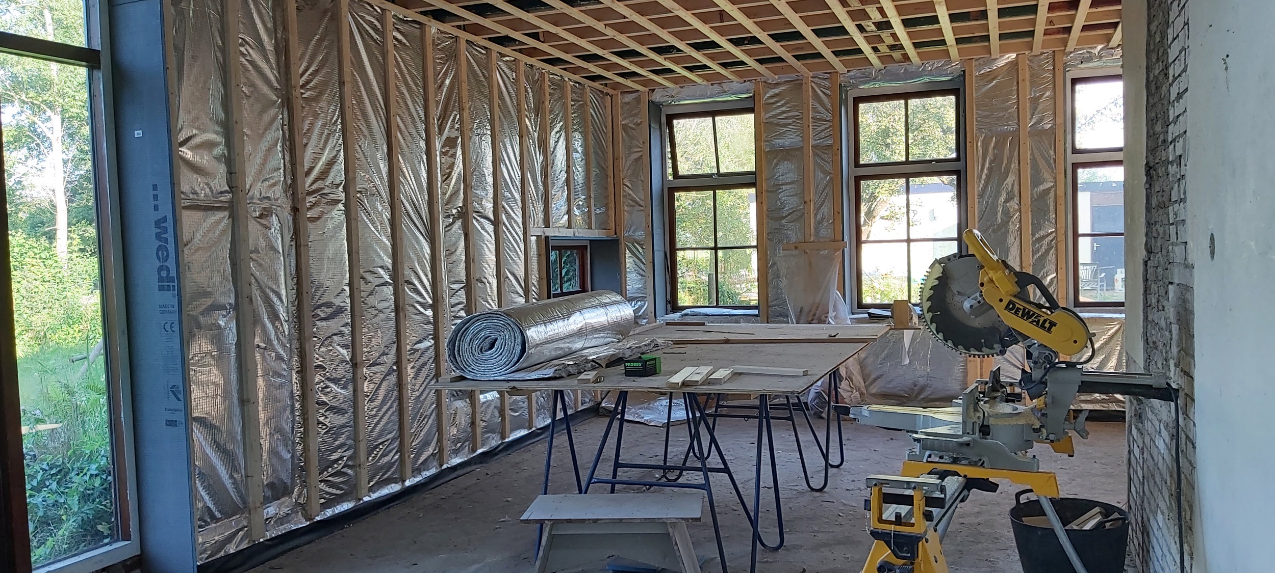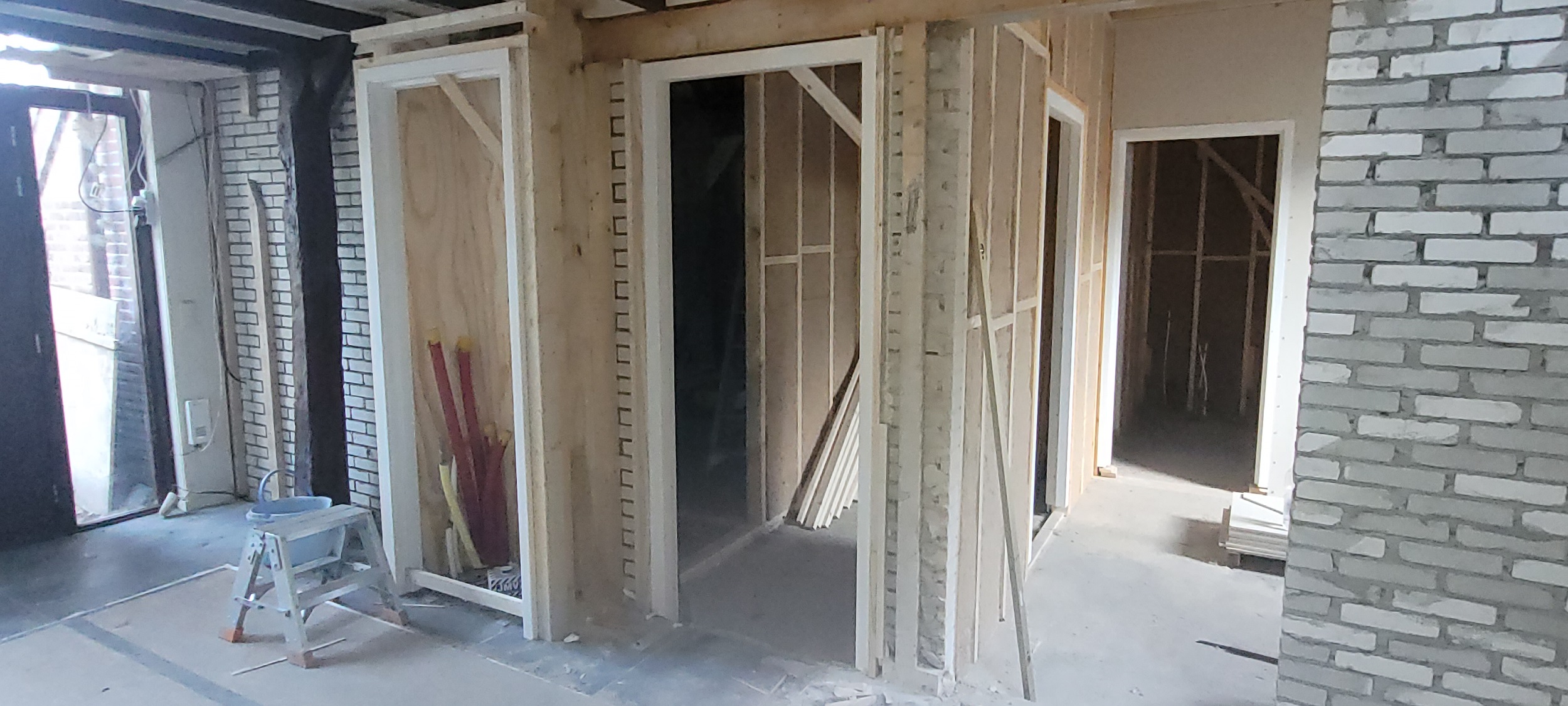 Beneden in de voormalige hal (voorheen de deel) hebben we een extra slaapkamer, badkamer en inloopkast gerealiseerd. Van een voormalige slaapkamer en badkamer hebben we één ruime slaapkamer gerealiseerd. Tussen de keuken en de woonkamer is de muur verwijderd. Om het dak te dragen is daar een staalconstructie geplaatst. Door de nieuwe balkenlaag in de woonkamer ligt de verdiepingsvloer hoger en hebben we de bestaande binnenmuren ook moeten verhogen. Alle binnenwanden zijn met isovlas geïsoleerd. Ook is een deel van de raamkozijnen vervangen.