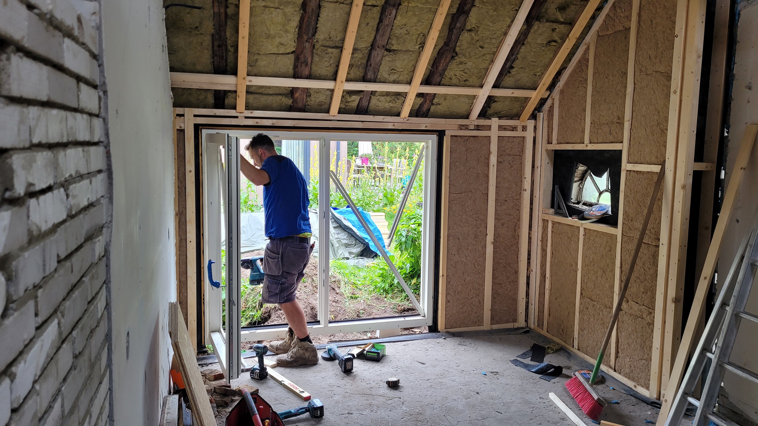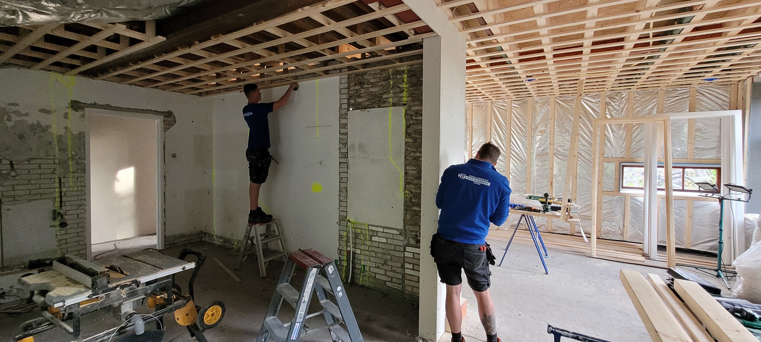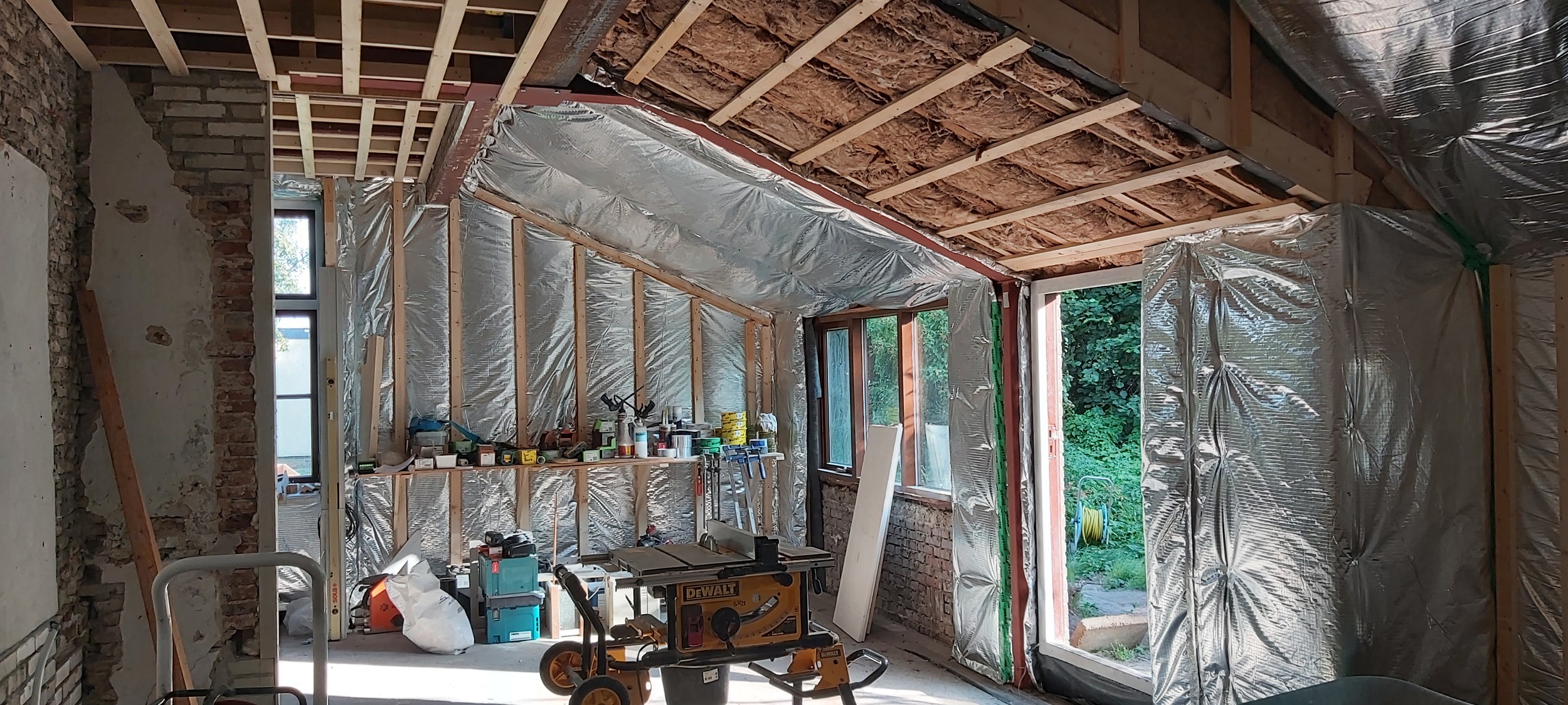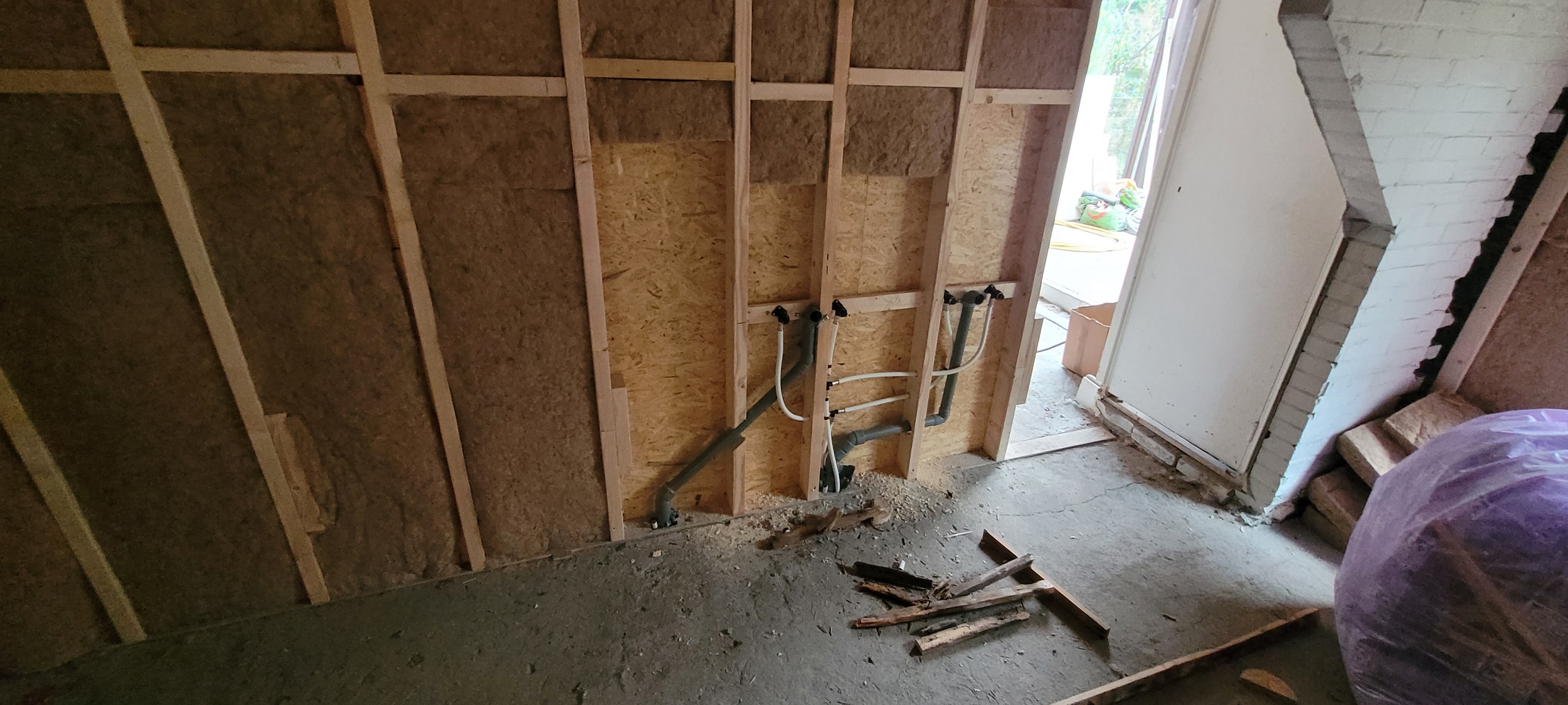 Beneden in de voormalige hal (voorheen de deel) hebben we een extra slaapkamer, badkamer en inloopkast gerealiseerd. Van een voormalige slaapkamer en badkamer hebben we één ruime slaapkamer gerealiseerd. Tussen de keuken en de woonkamer is de muur verwijderd. Om het dak te dragen is daar een staalconstructie geplaatst. Door de nieuwe balkenlaag in de woonkamer ligt de verdiepingsvloer hoger en hebben we de bestaande binnenmuren ook moeten verhogen. Alle binnenwanden zijn met isovlas geïsoleerd. Ook is een deel van de raamkozijnen vervangen.