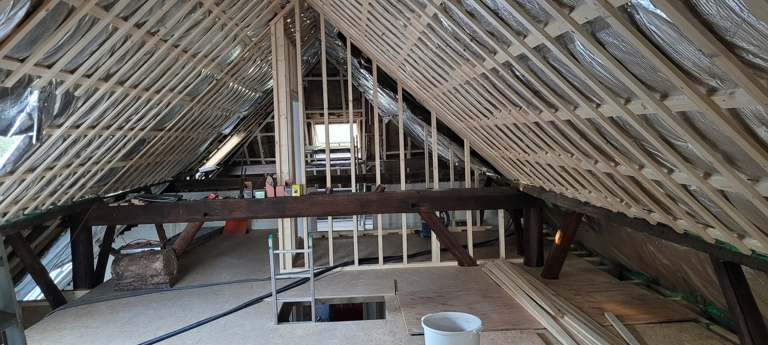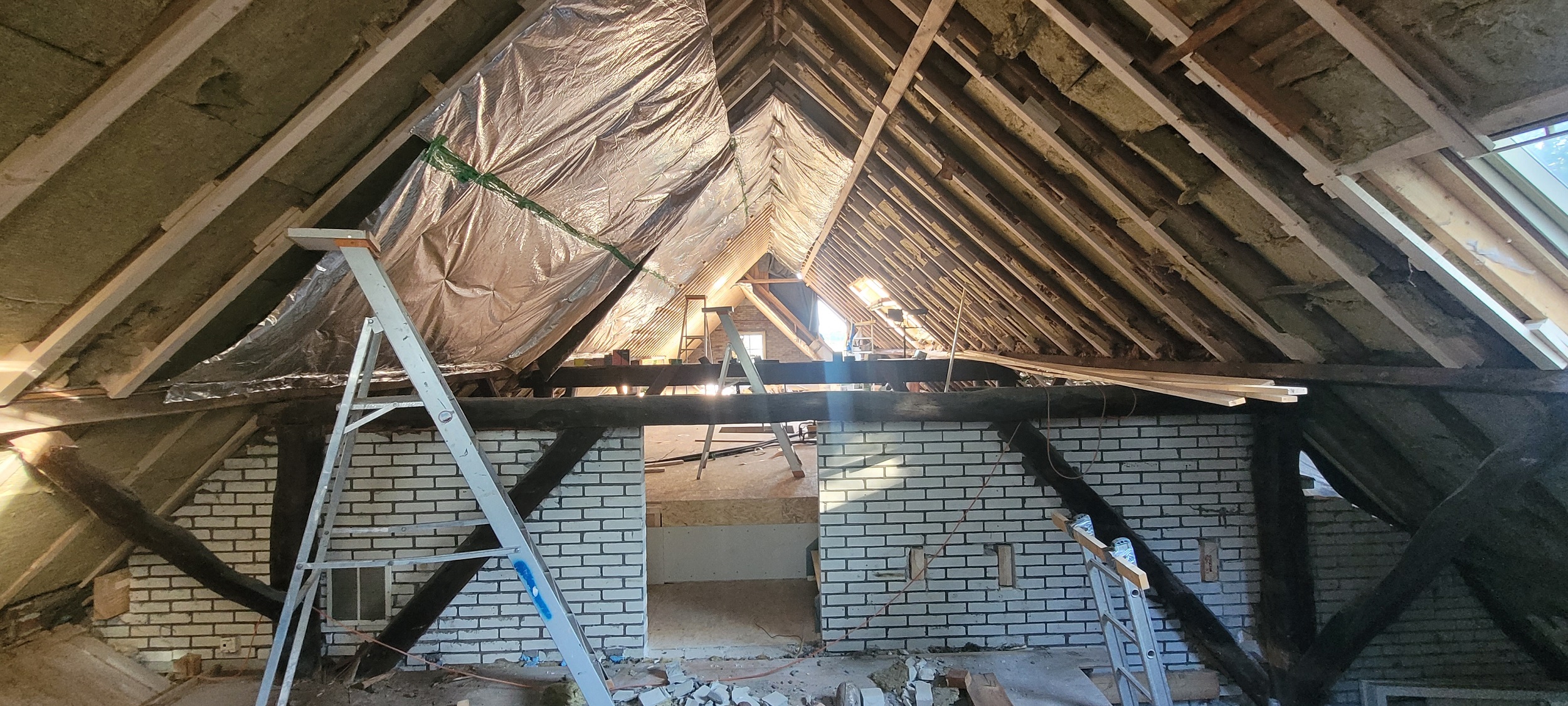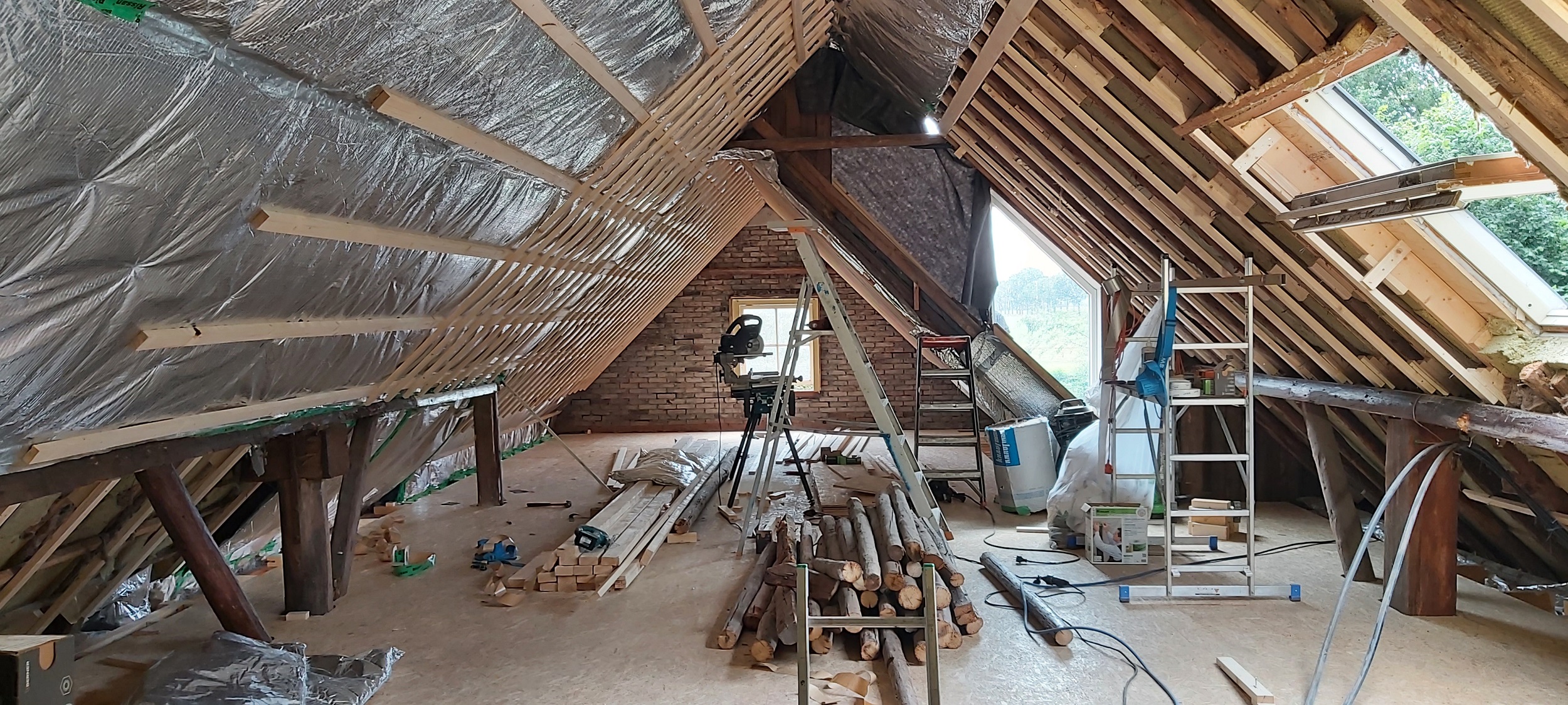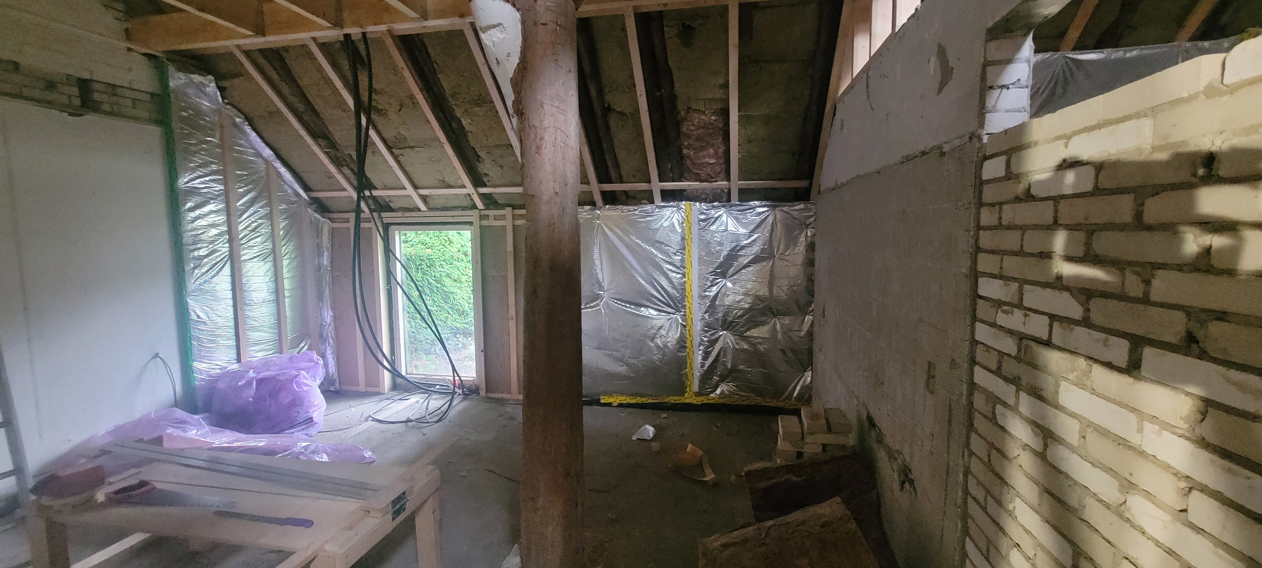 Afgelopen maand is er in deze boerderij hard gewerkt. Het glaswol aan de binnenzijde van het dak is volledig verwijderd, maar het steenwol hebben we laten zitten en waar nodig aangevuld met Knauf isolatie. Het dak is van voor naar achteren uitgevlakt en voorzien van superquilt. Inmiddels zijn twee liggers doorgezaagd (i.p.v. eentje laten zakken) om een doorgang te realiseren naar een slaapkamer en de rest van de verdieping. Achter in de deel is een trekstang met wartel aangebracht.