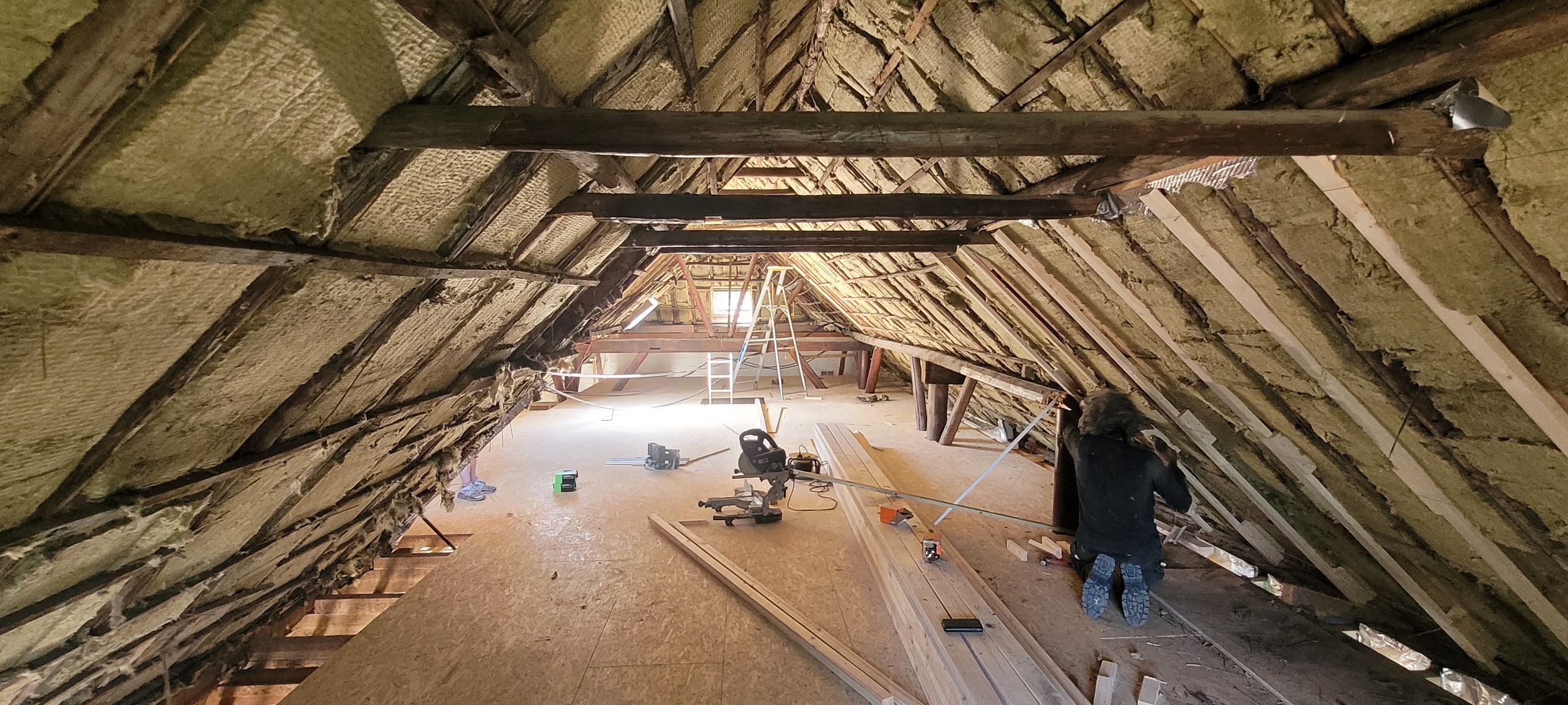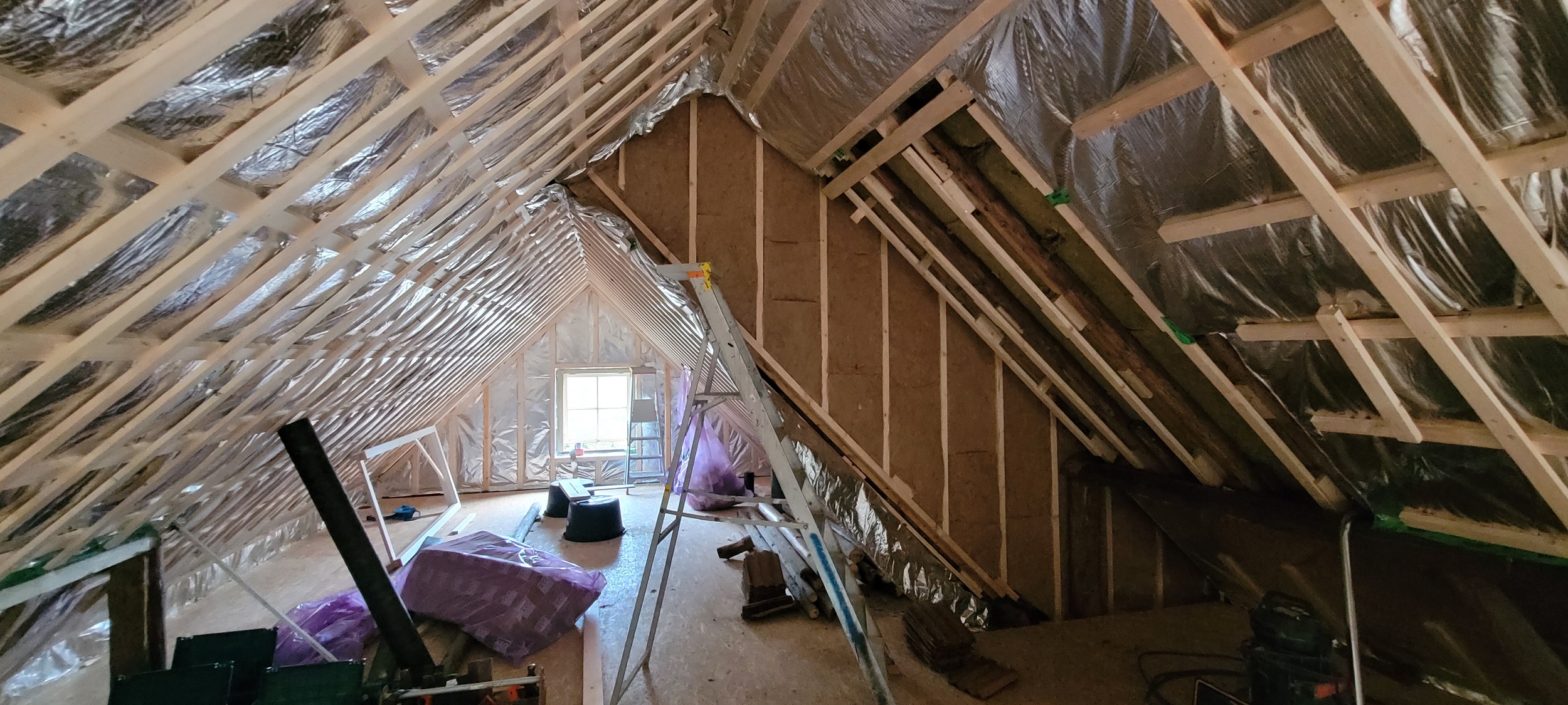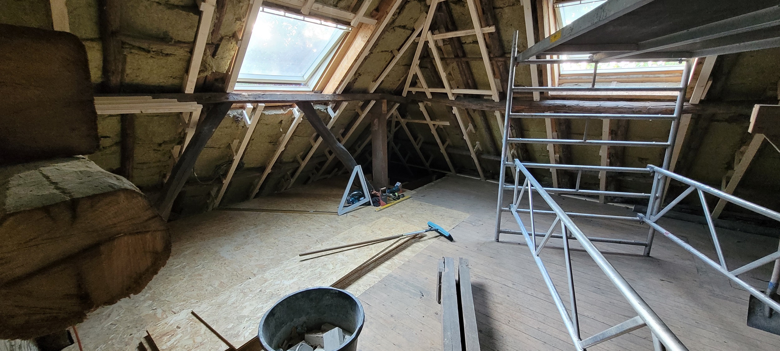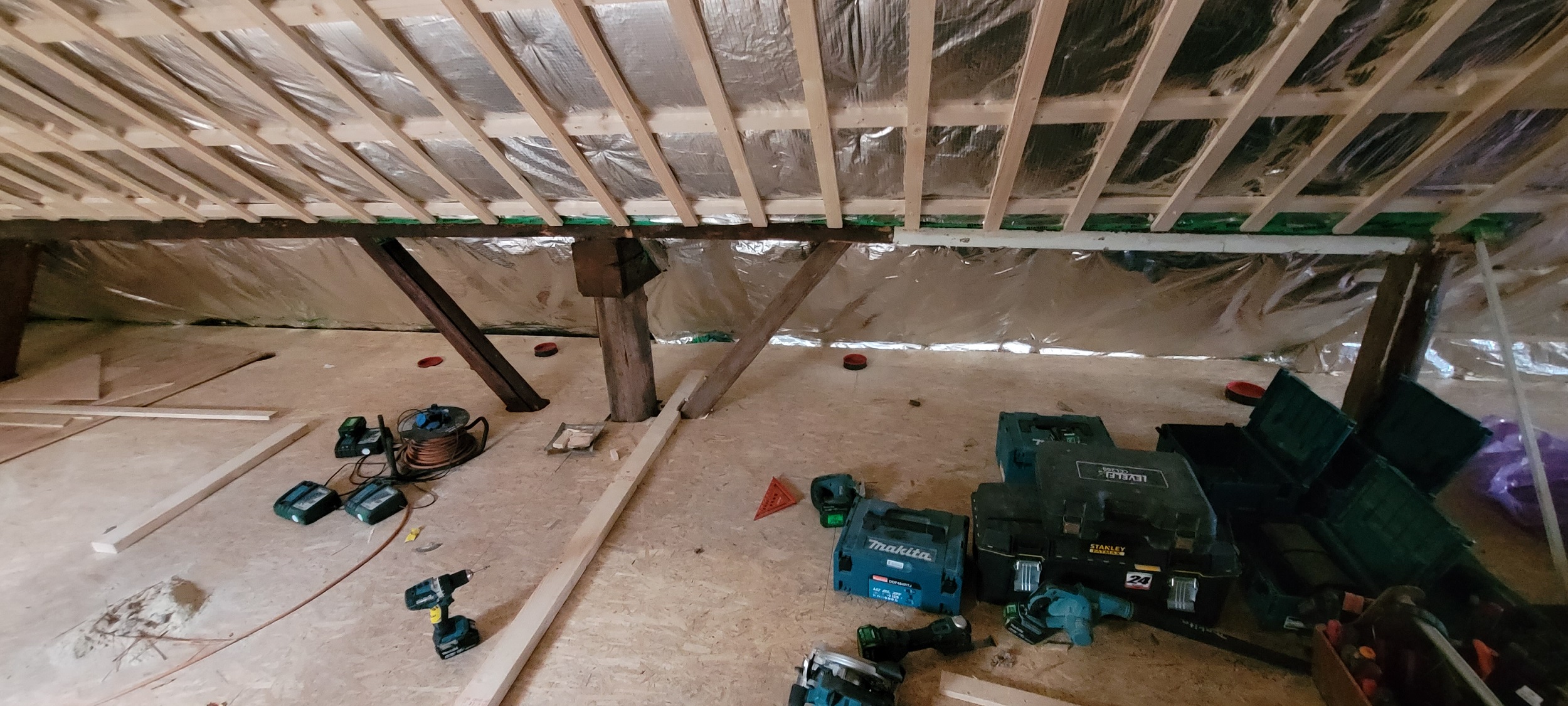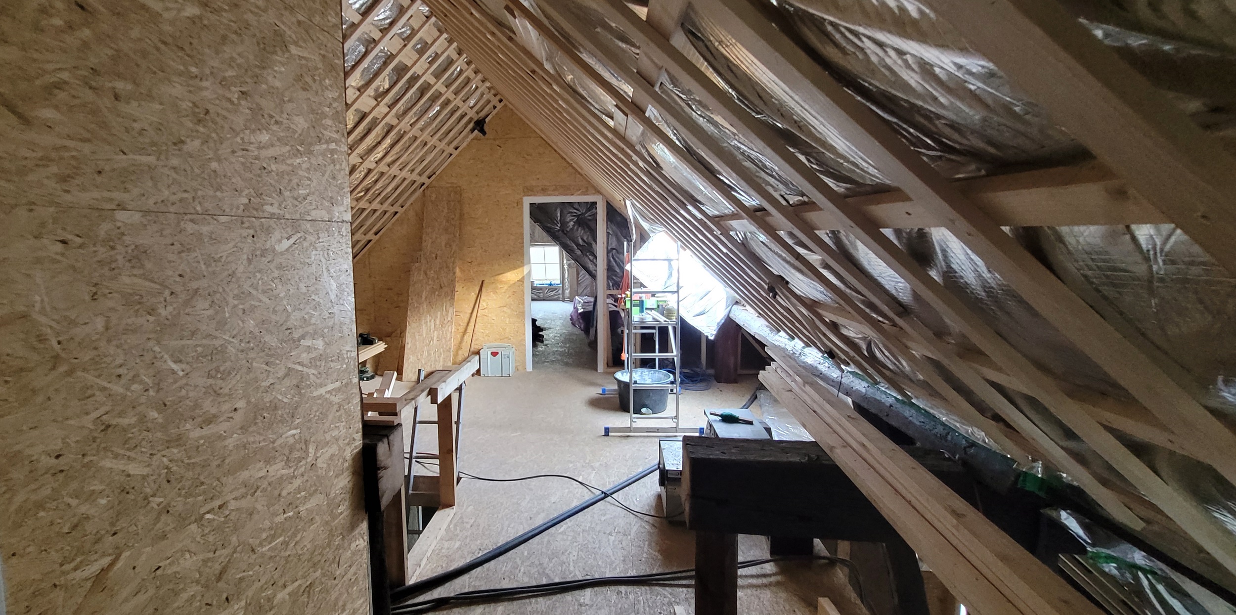 Afgelopen maand is er in deze boerderij hard gewerkt. Het glaswol aan de binnenzijde van het dak is volledig verwijderd, maar het steenwol hebben we laten zitten en waar nodig aangevuld met Knauf isolatie. Het dak is van voor naar achteren uitgevlakt en voorzien van superquilt. Inmiddels zijn twee liggers doorgezaagd (i.p.v. eentje laten zakken) om een doorgang te realiseren naar een slaapkamer en de rest van de verdieping. Achter in de deel is een trekstang met wartel aangebracht.