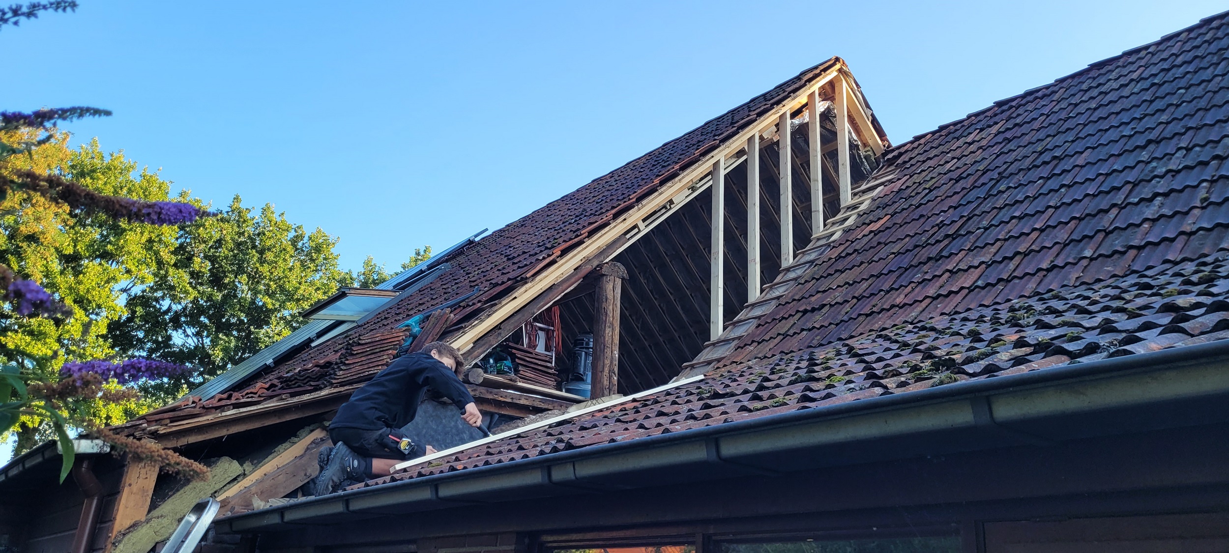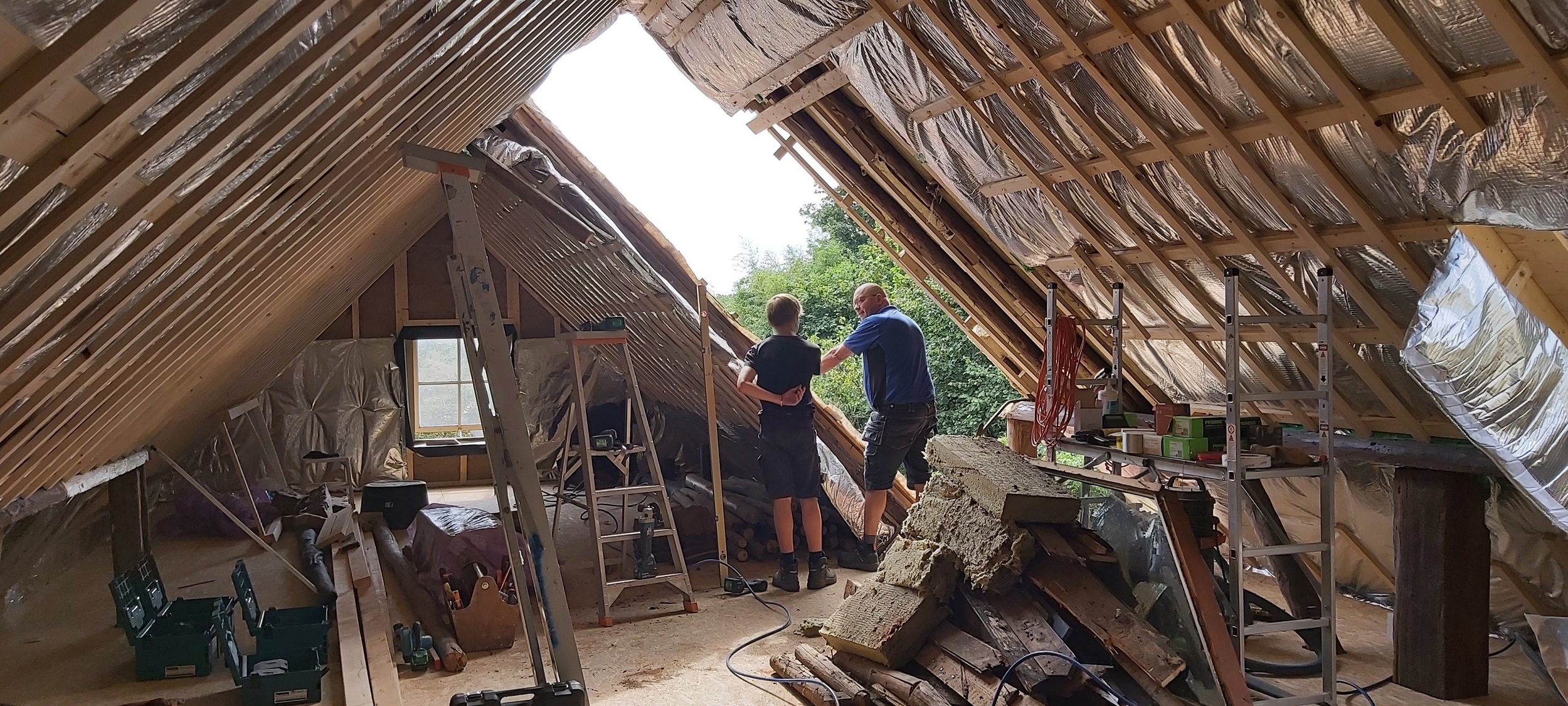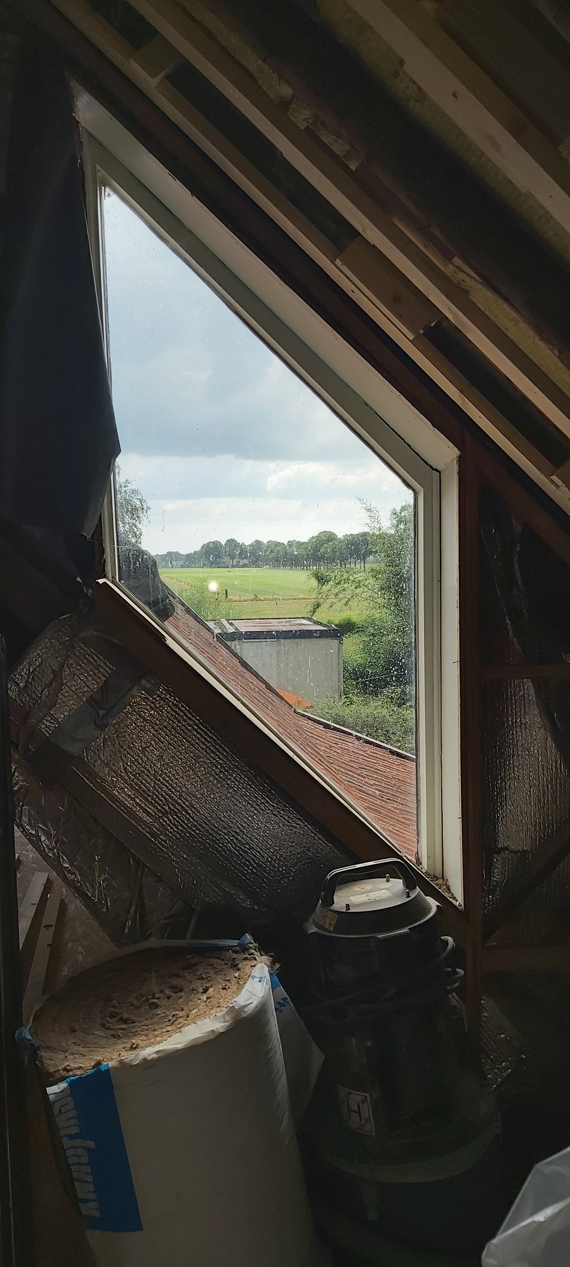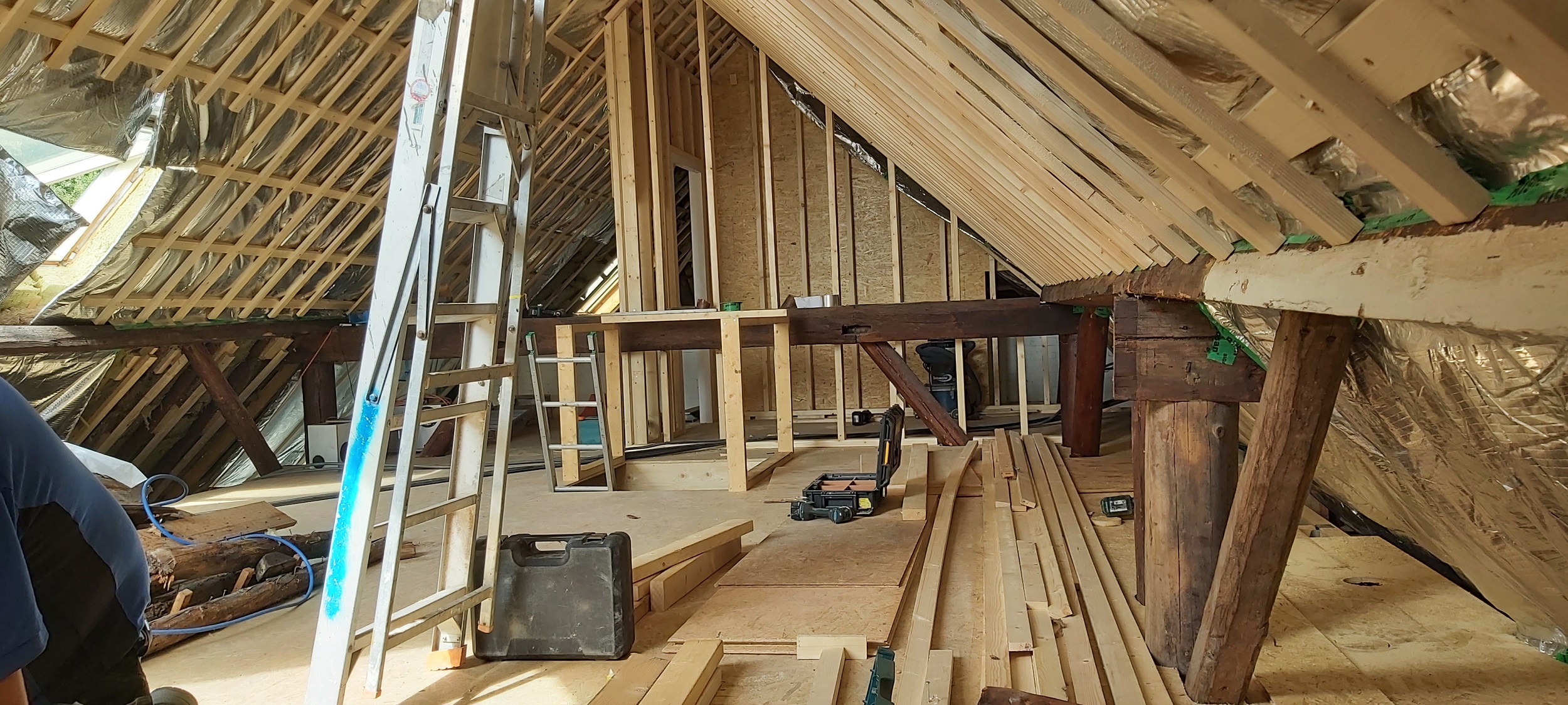 Afgelopen maand is er in deze boerderij hard gewerkt. Het glaswol aan de binnenzijde van het dak is volledig verwijderd, maar het steenwol hebben we laten zitten en waar nodig aangevuld met Knauf isolatie. Het dak is van voor naar achteren uitgevlakt en voorzien van superquilt. Inmiddels zijn twee liggers doorgezaagd (i.p.v. eentje laten zakken) om een doorgang te realiseren naar een slaapkamer en de rest van de verdieping. Achter in de deel is een trekstang met wartel aangebracht.