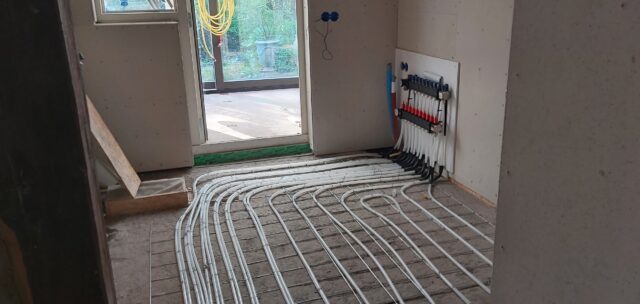 Sjabbens installatietechniek heeft inmiddels bijna alle elektrapunten en datapunten klaar. Ook zijn alle pvc-leidingen aangelegd, de elektradraden door de leidingen getrokken en de datakabels aangelegd. De nieuwe meterkast is klaar voor de schouw. Op drie plekken in de boerderij zijn vloerverwarmingverdelers aangelegd. Boven naast de badkamer is een technische ruimte gemaakt.