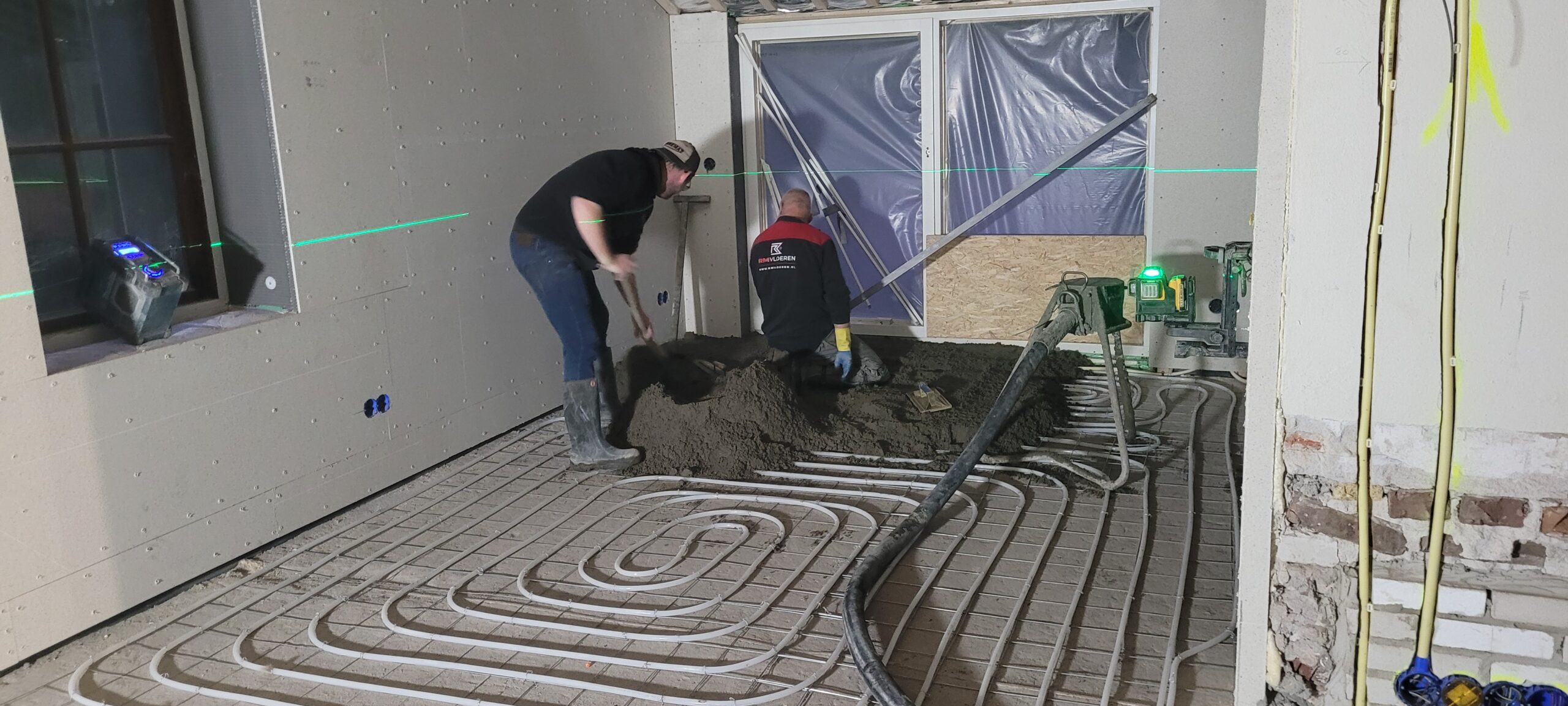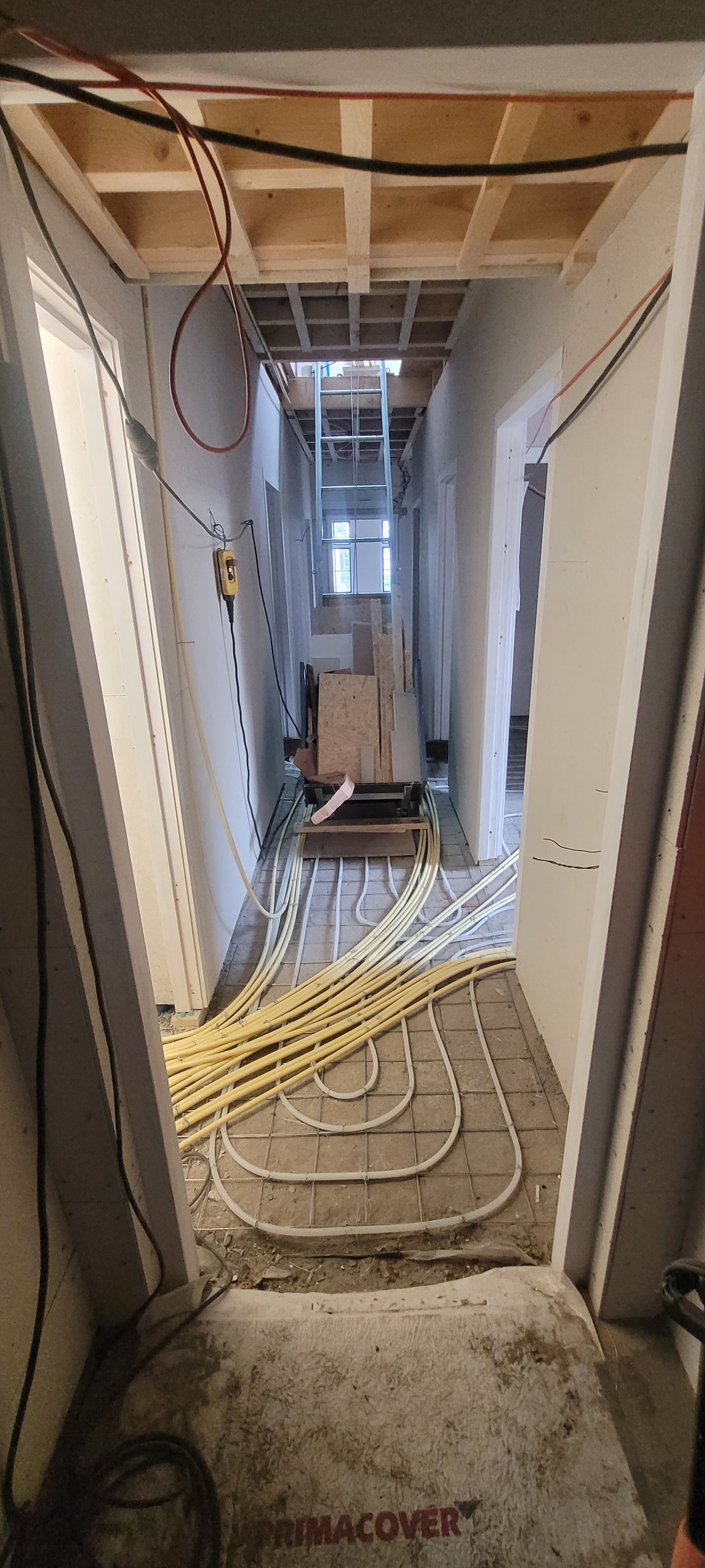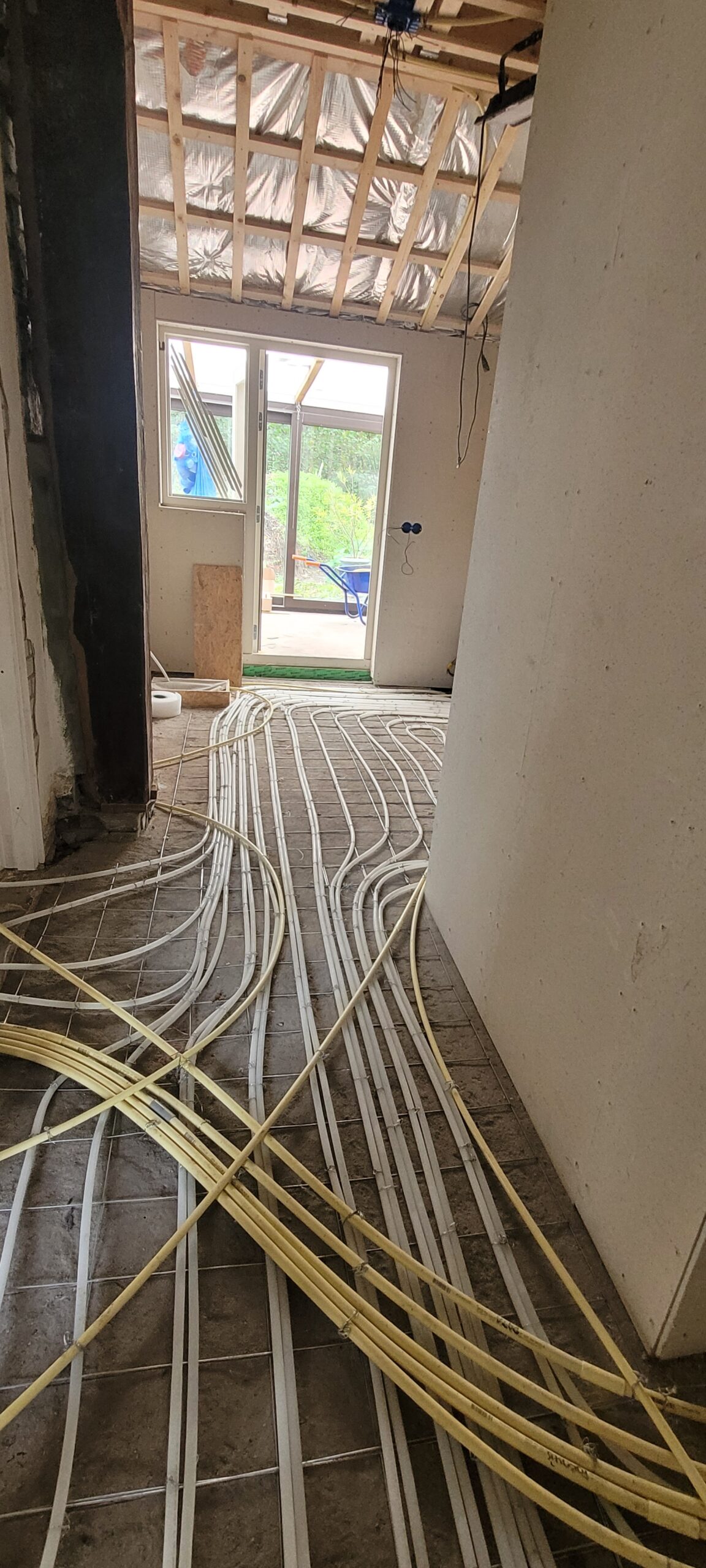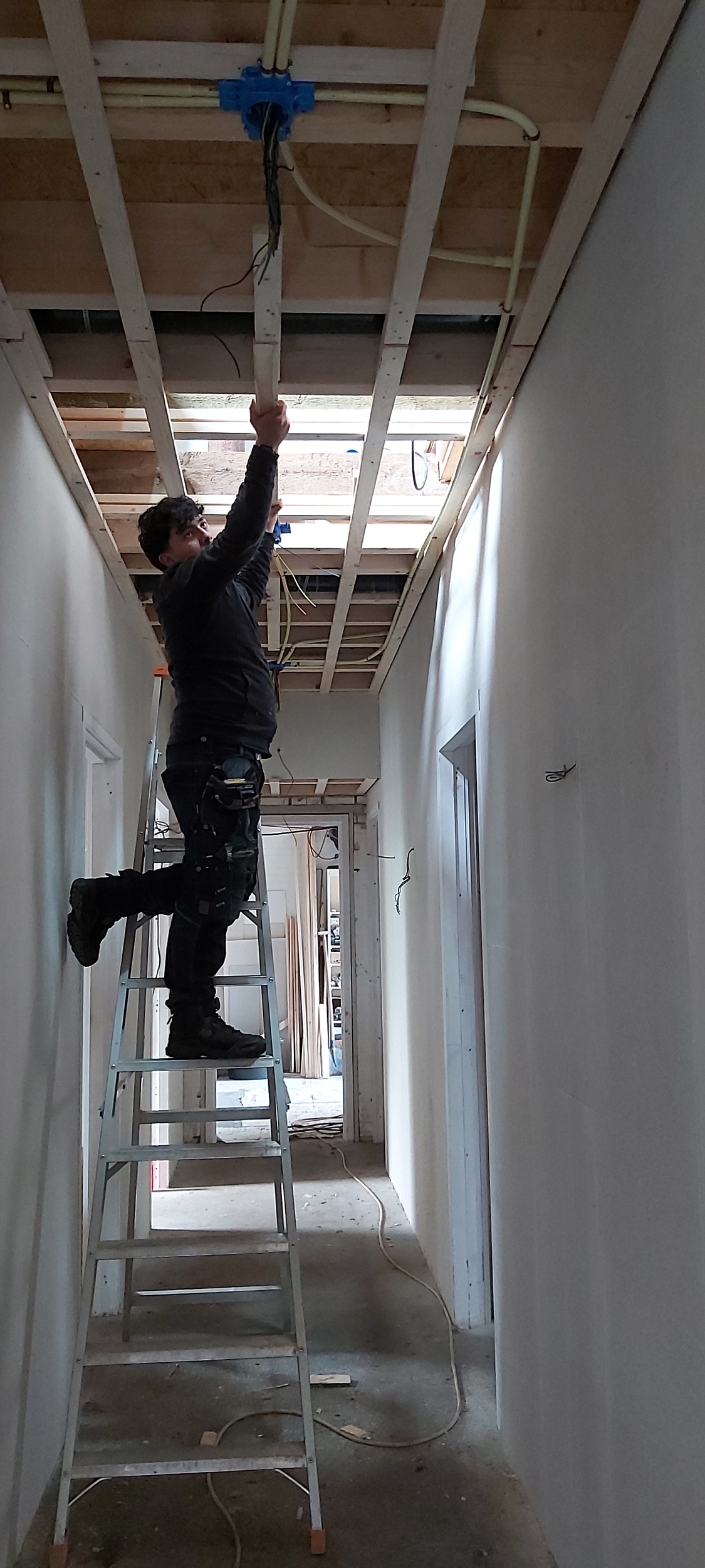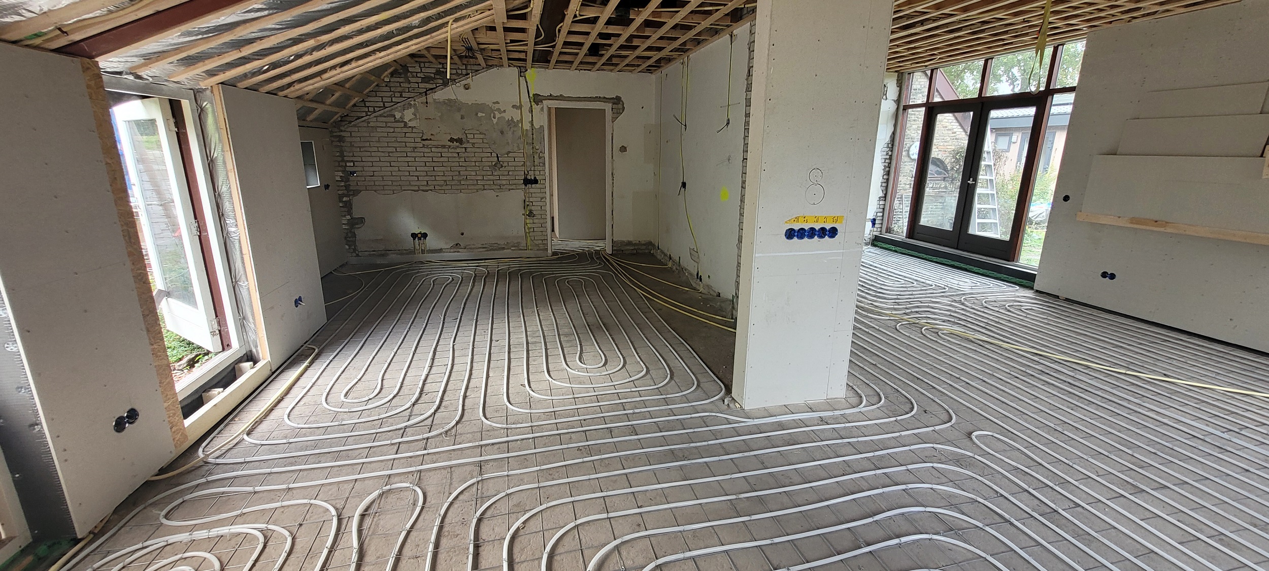 Sjabbens installatietechniek heeft inmiddels bijna alle elektrapunten en datapunten klaar. Ook zijn alle pvc-leidingen aangelegd, de elektradraden door de leidingen getrokken en de datakabels aangelegd. De nieuwe meterkast is klaar voor de schouw. Op drie plekken in de boerderij zijn vloerverwarmingverdelers aangelegd. Boven naast de badkamer is een technische ruimte gemaakt.