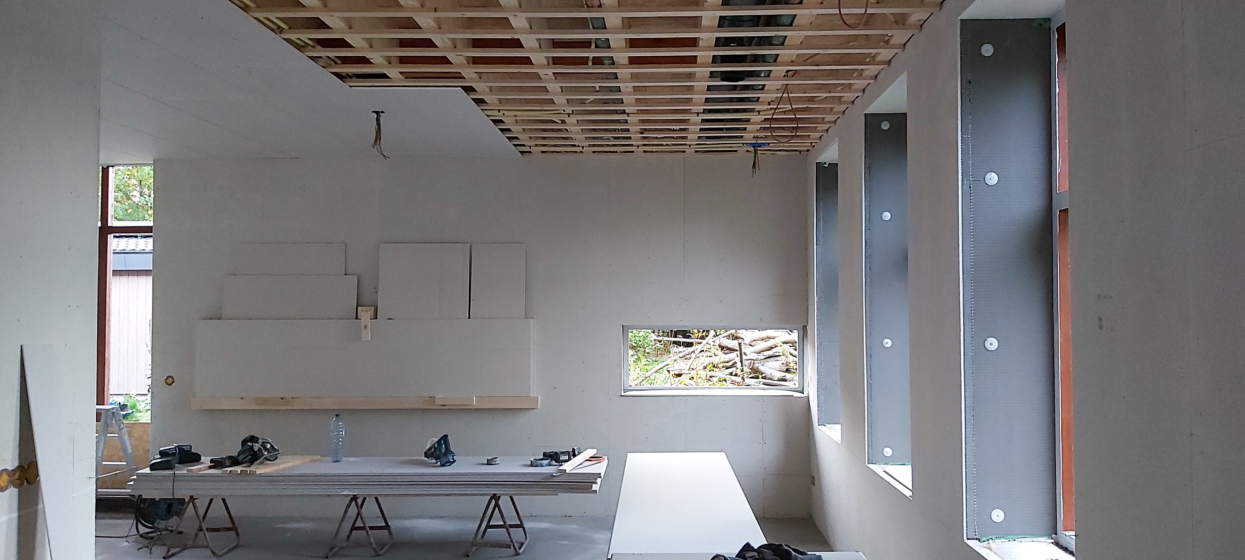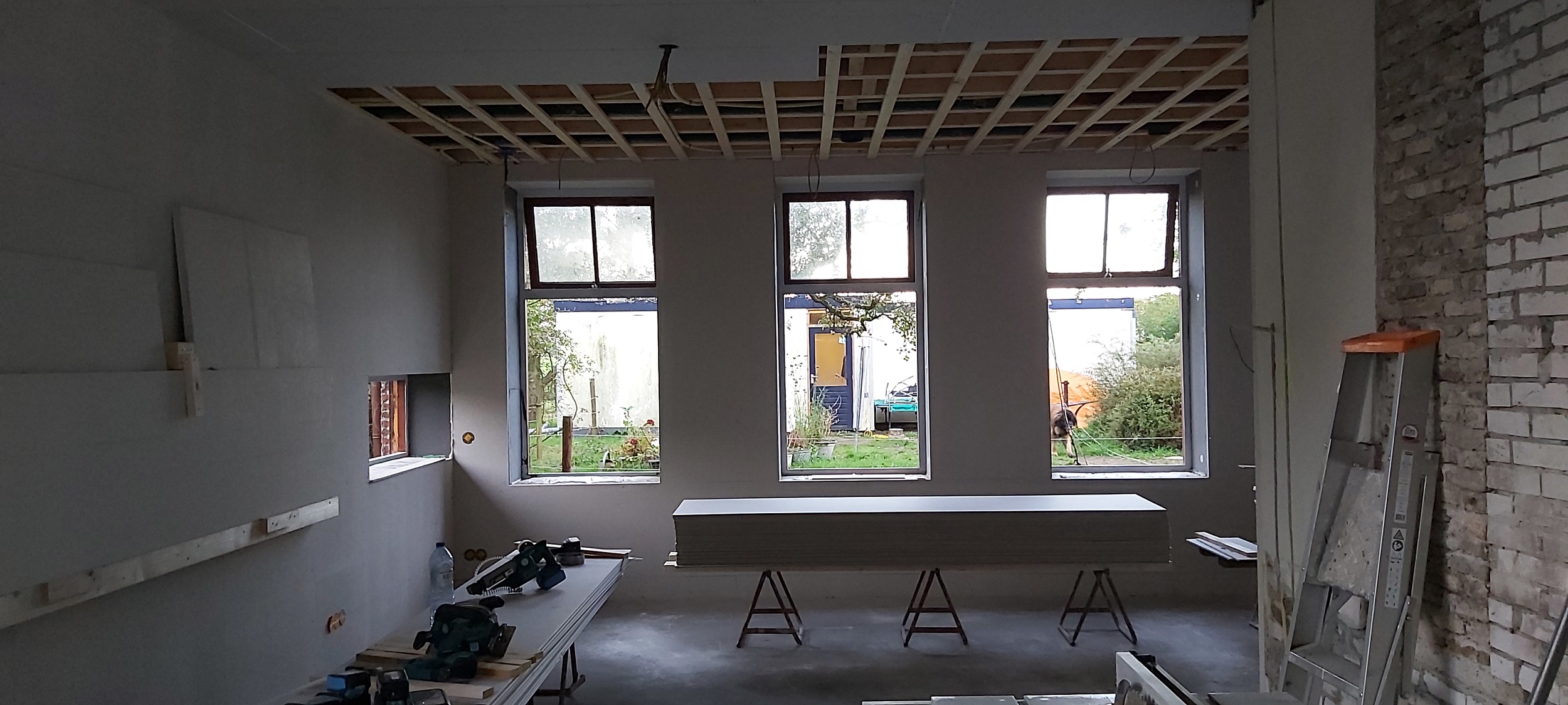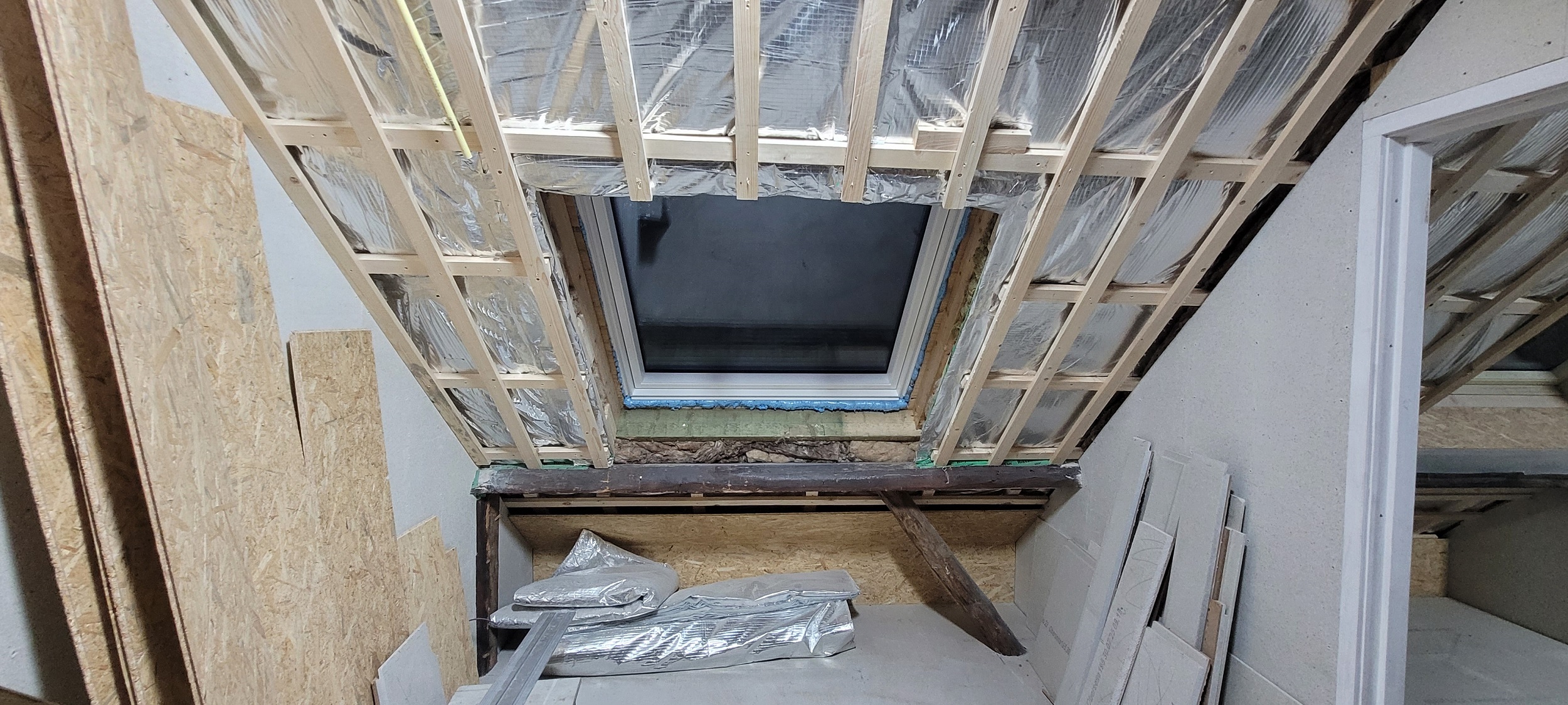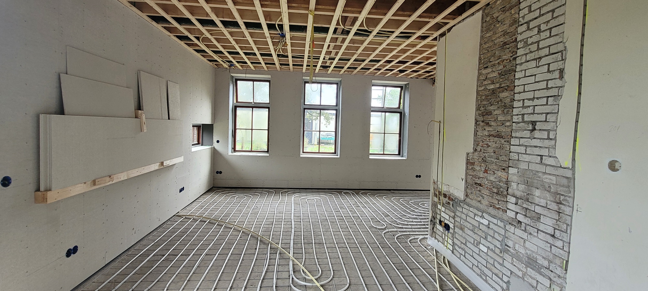 Begin oktober is op de begane grond en in de badkamer boven de vloerverwarming gelegd. Daar overheen is de dekvloer gestort. Boven hebben we drie nieuwe Velux-dakramen geplaatst, in de badkamer en in beide slaapkamers. De schuine wanden (dakwanden) op de bovenverdieping worden afgetimmerd met OSB-platen. Alle rechte wanden zijn afgetimmerd met Fermacell gipsvezelplaten. Deze platen worden gestuct.
