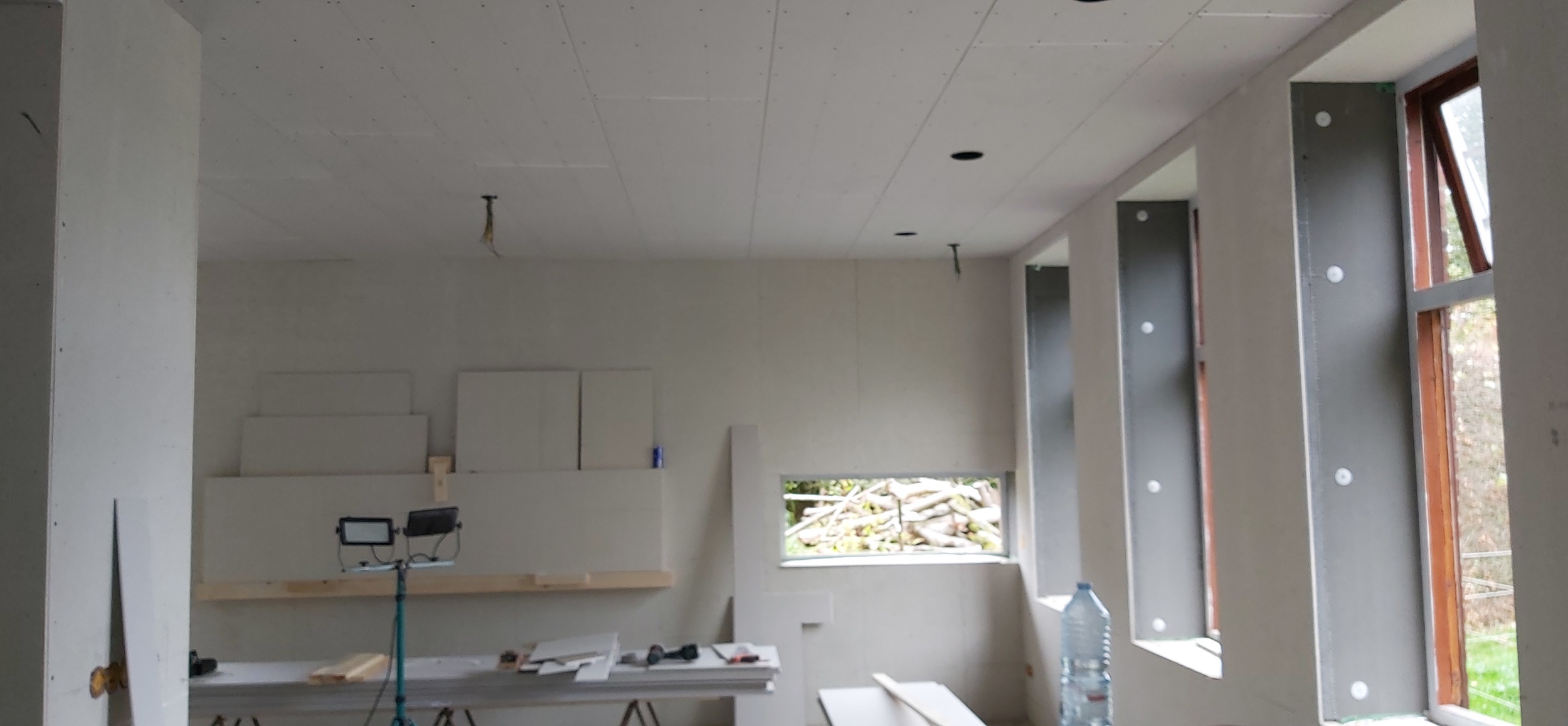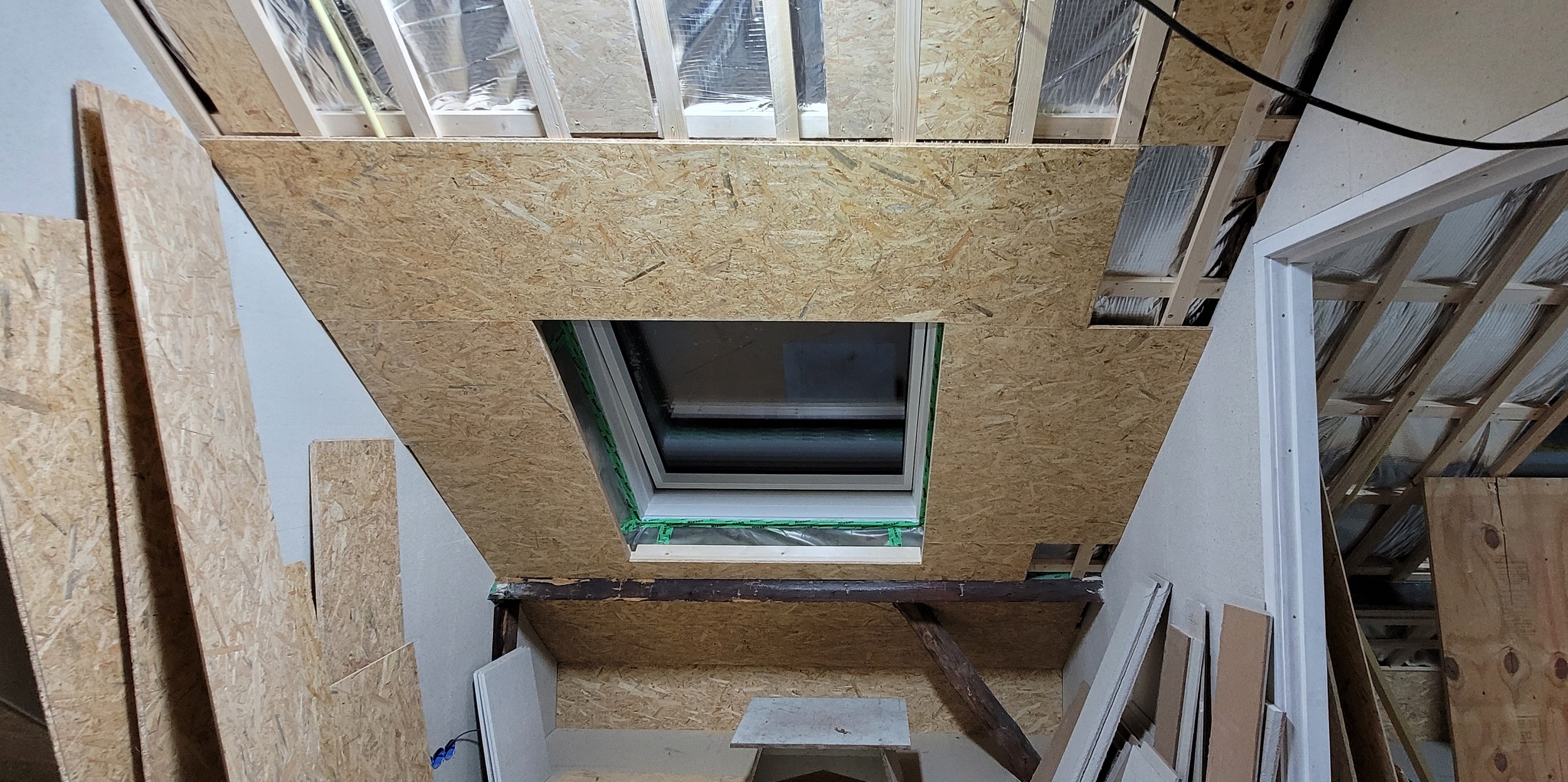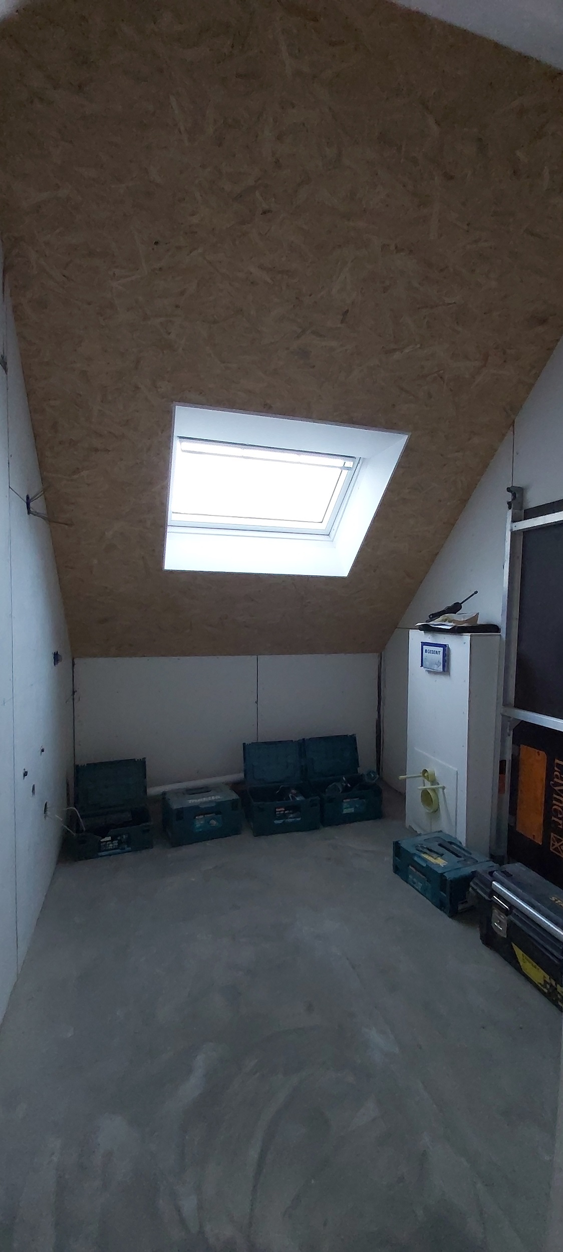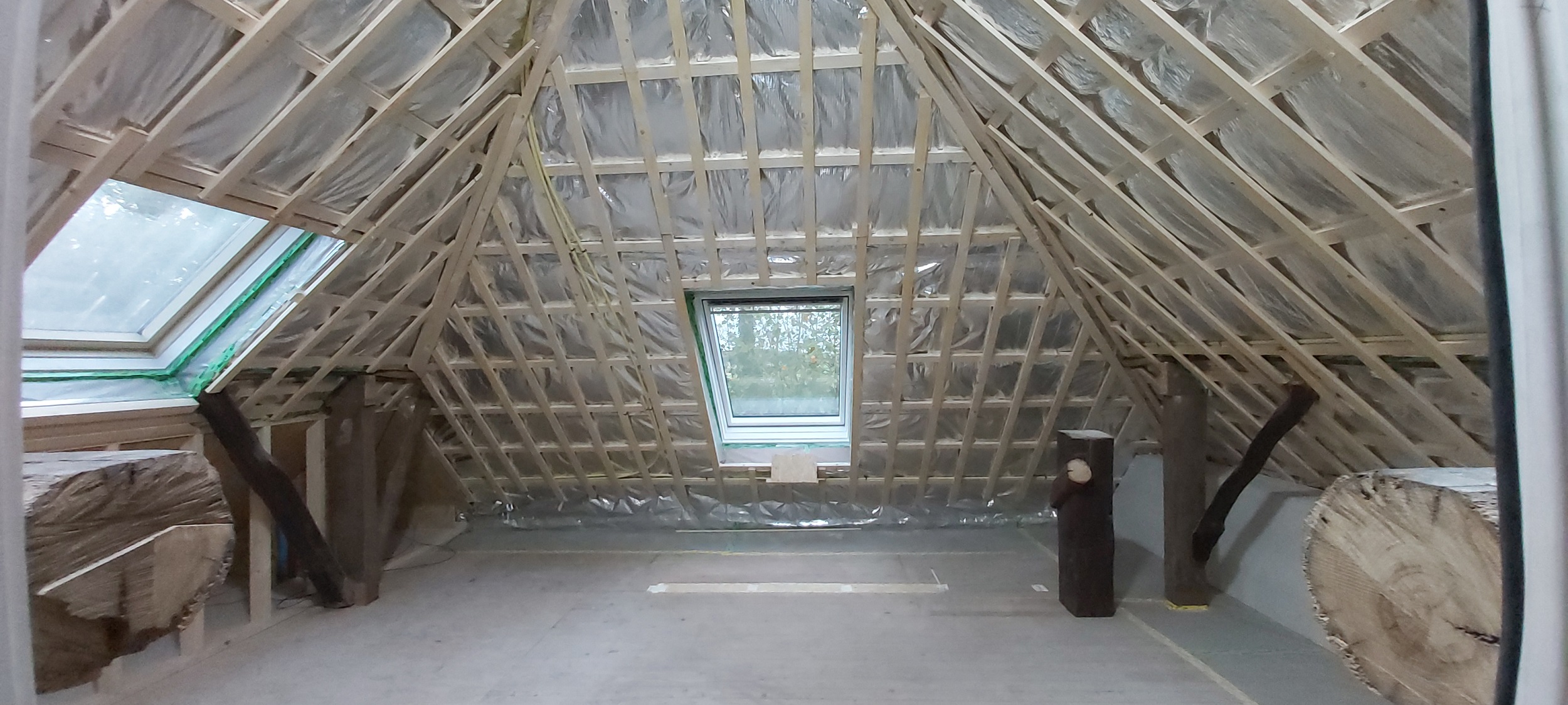 Begin oktober is op de begane grond en in de badkamer boven de vloerverwarming gelegd. Daar overheen is de dekvloer gestort. Boven hebben we drie nieuwe Velux-dakramen geplaatst, in de badkamer en in beide slaapkamers. De schuine wanden (dakwanden) op de bovenverdieping worden afgetimmerd met OSB-platen. Alle rechte wanden zijn afgetimmerd met Fermacell gipsvezelplaten. Deze platen worden gestuct.