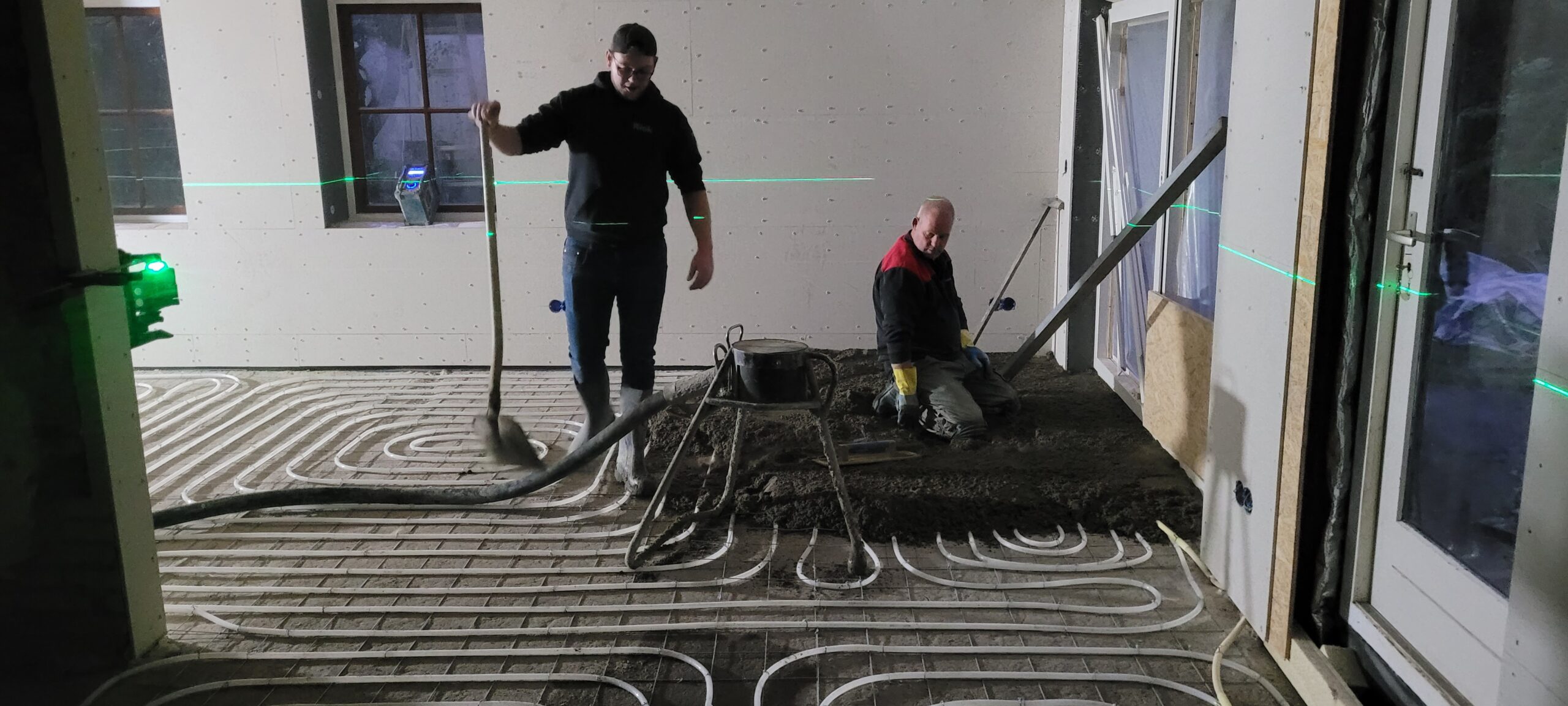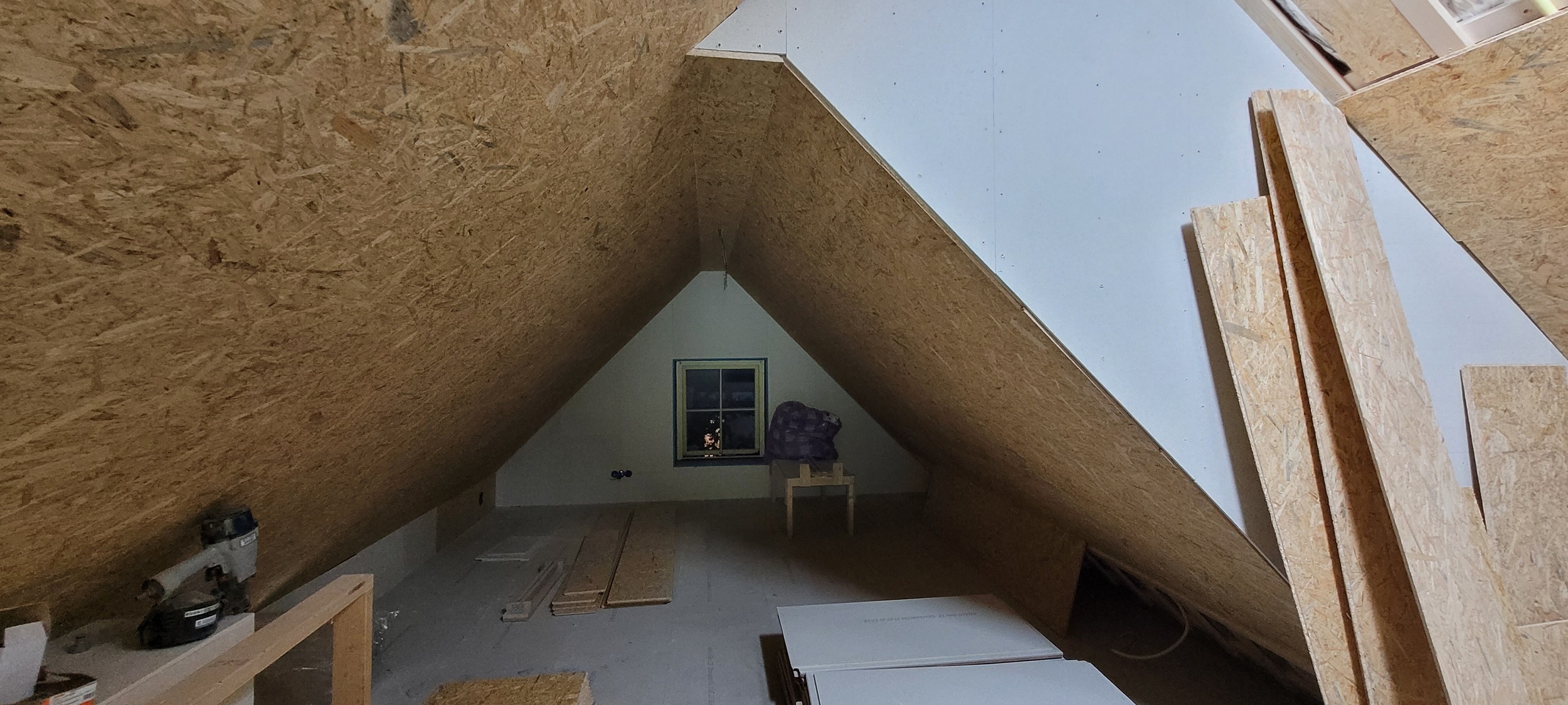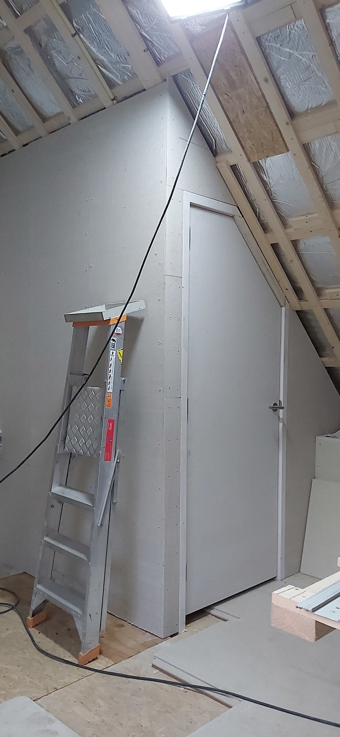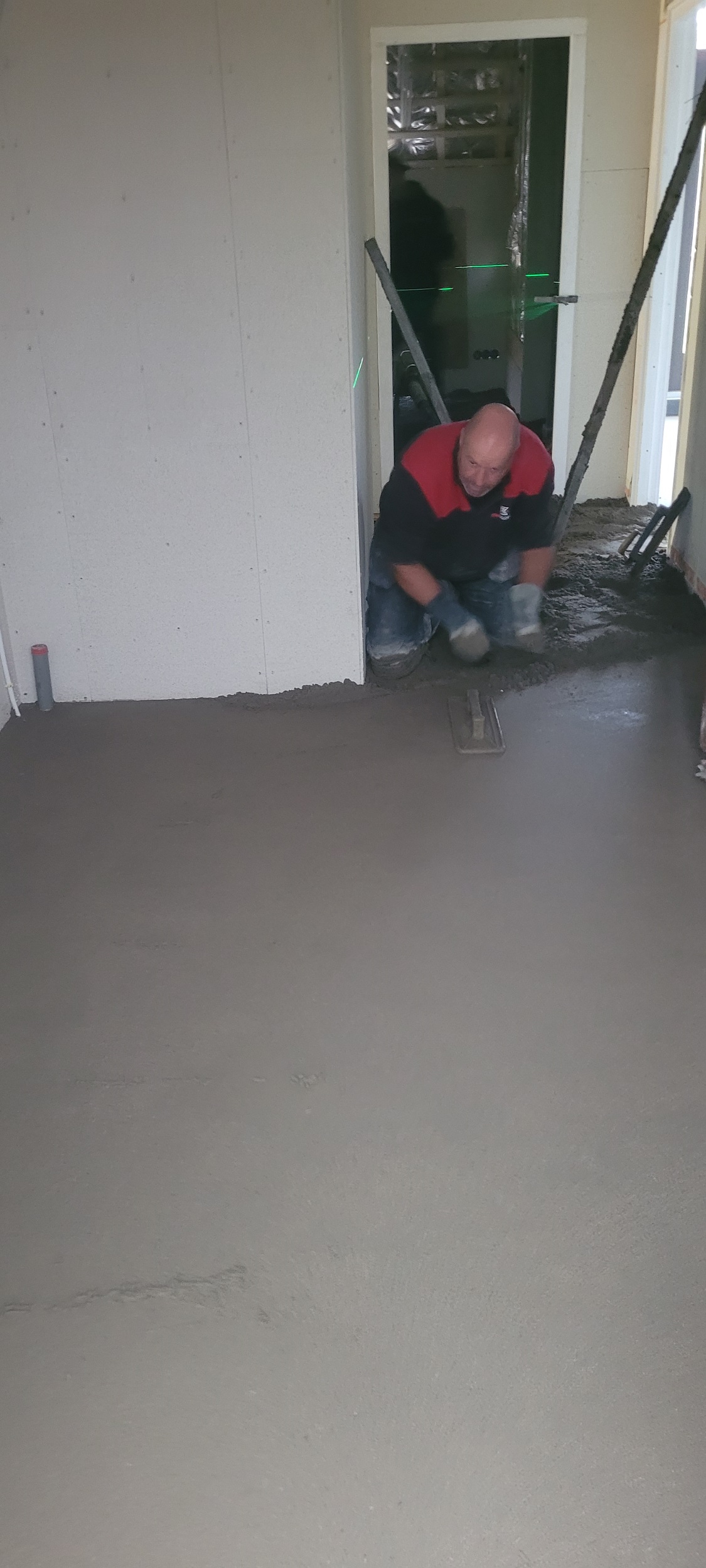 Begin oktober is op de begane grond en in de badkamer boven de vloerverwarming gelegd. Daar overheen is de dekvloer gestort. Boven hebben we drie nieuwe Velux-dakramen geplaatst, in de badkamer en in beide slaapkamers. De schuine wanden (dakwanden) op de bovenverdieping worden afgetimmerd met OSB-platen. Alle rechte wanden zijn afgetimmerd met Fermacell gipsvezelplaten. Deze platen worden gestuct.