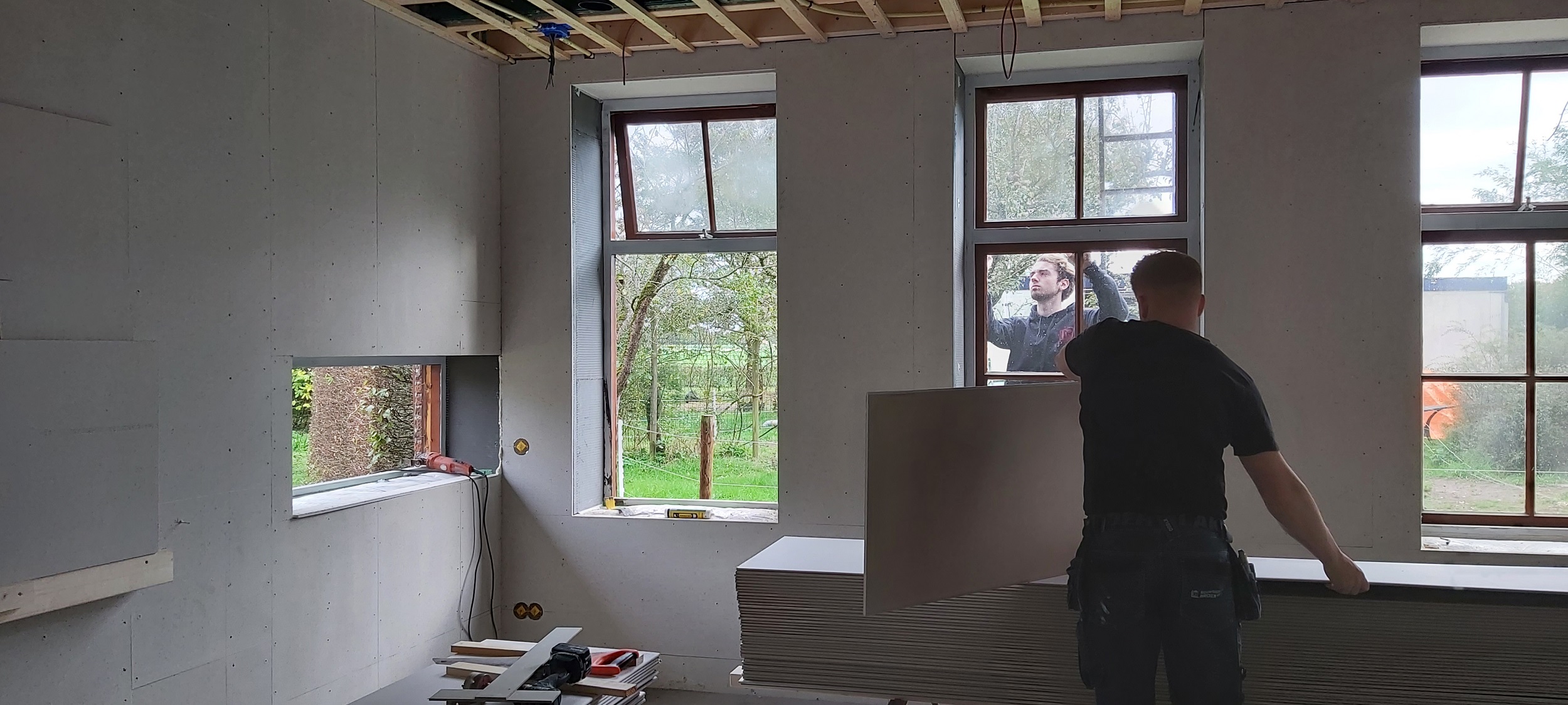 Inmiddels is er beneden een aanvang gemaakt met het aftimmeren van de plafonds. De oude raamkozijnen aan de voorzijde van de boerderij zijn verwijderd. De nieuwe en bestaande raamkozijnen worden voorzien van triple glas. De oude stalramen zijn in slechte staat en worden allemaal vervangen. De nieuwe stalramen laten we uitvoeren in Tricoya mdf en worden voorzien van triple glas.