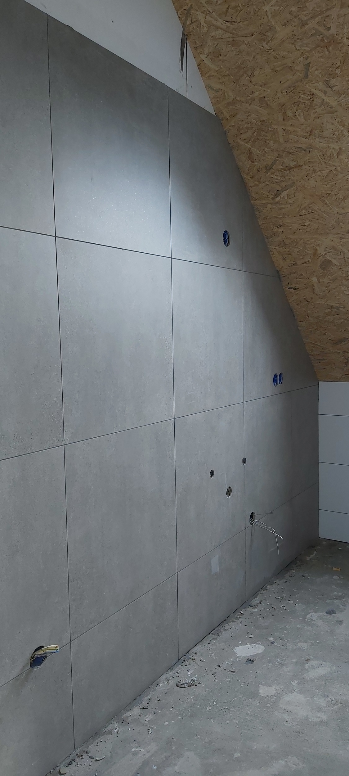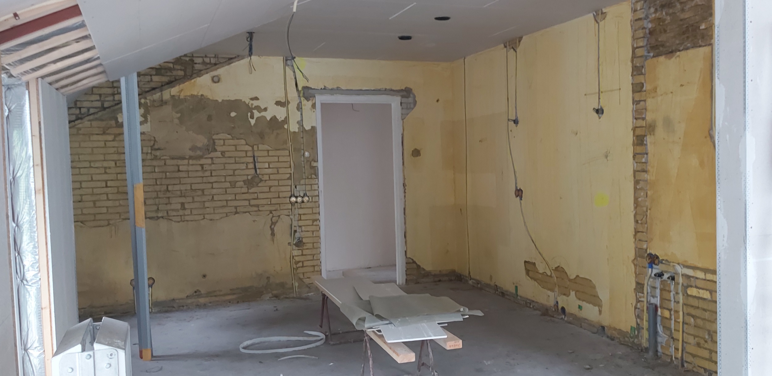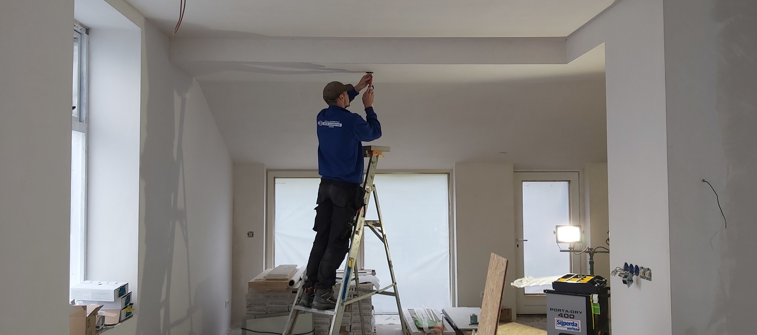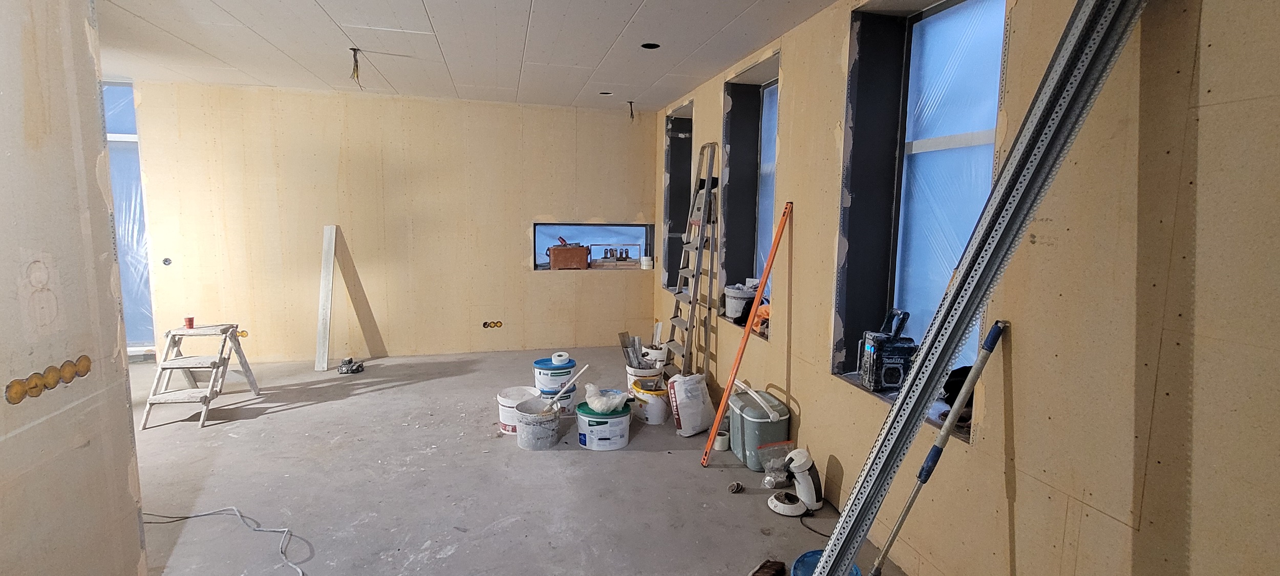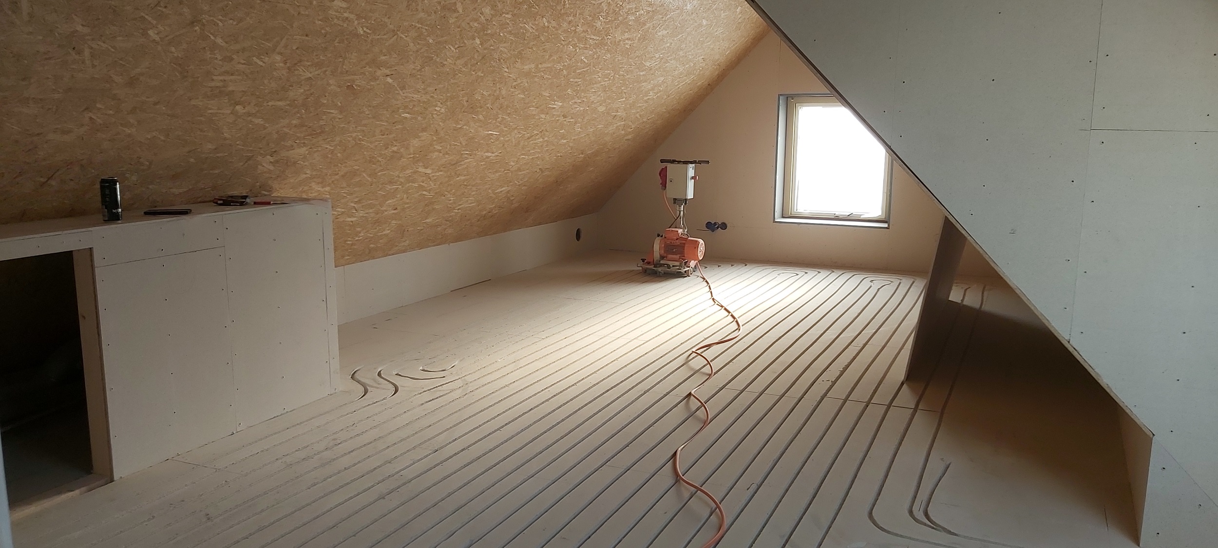 Op de verdiepingsvloer is de vloerverwarming ingefreesd. Sjabbens is bezig met alle elektrapunten, inrichting van de meterkast, aansluiten van de vloerverwarming en de cv-ketel in de technische ruimte. Oosterloo Tegelwerken is begonnen met het tegelen van de wanden in de badkamers en het toilet.