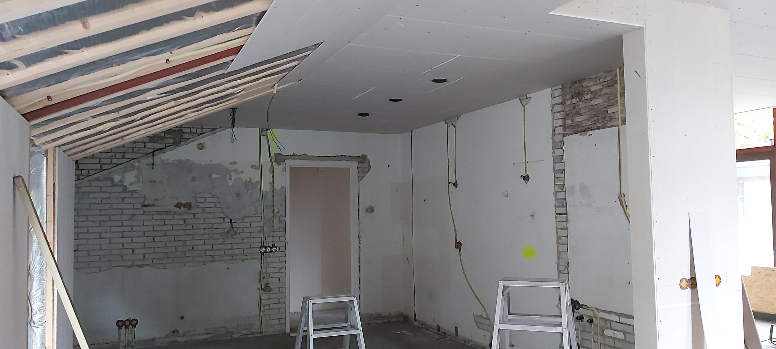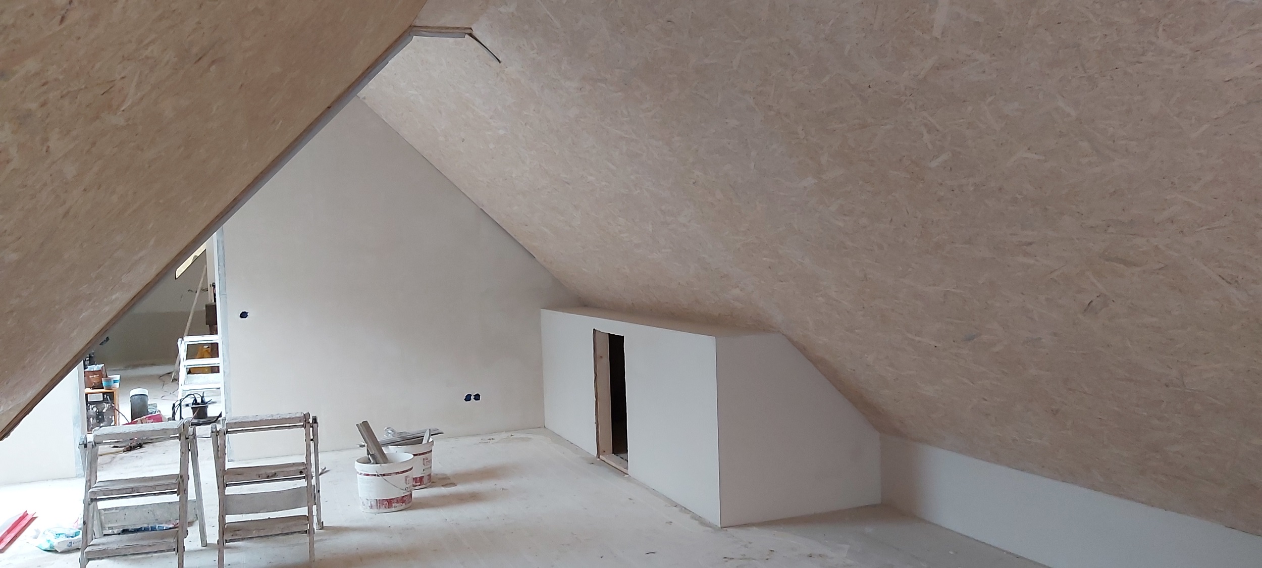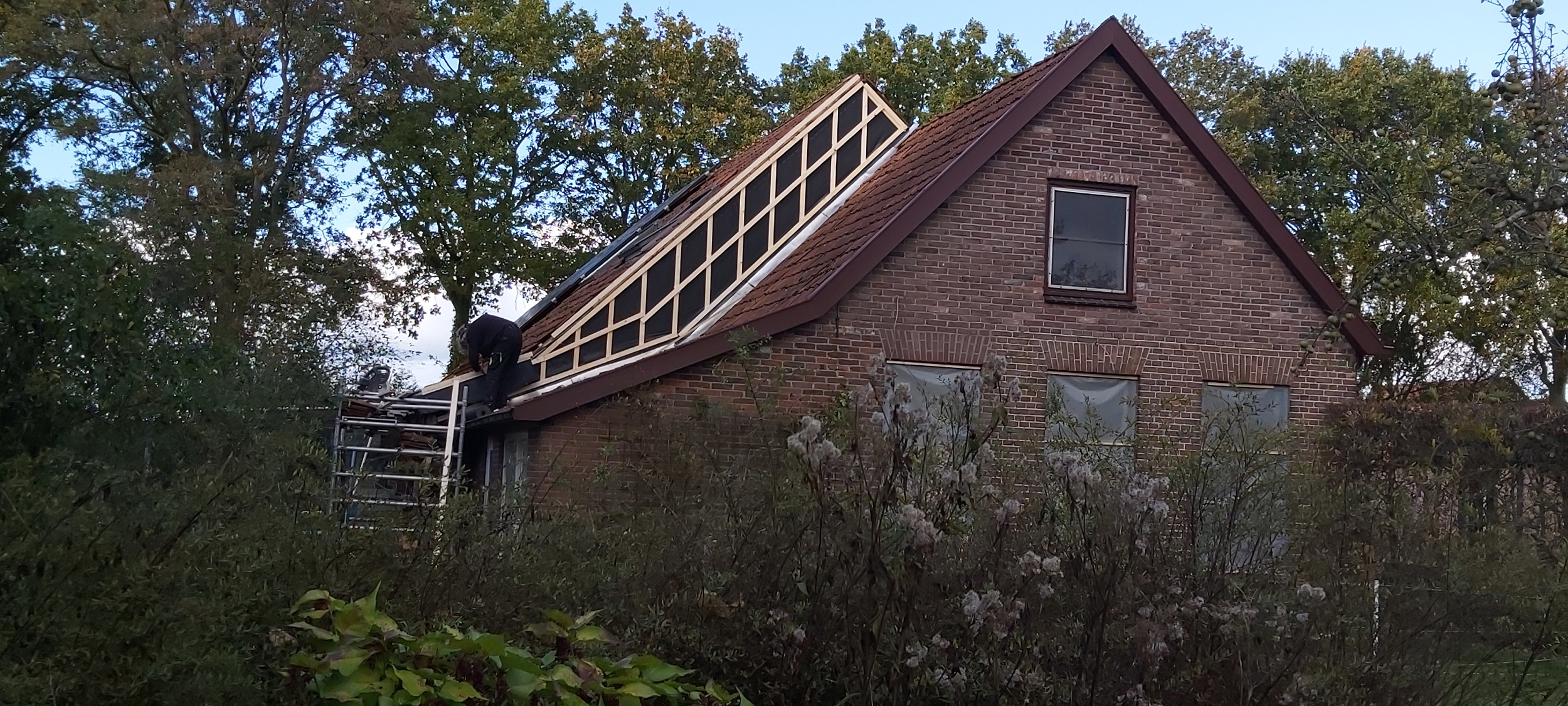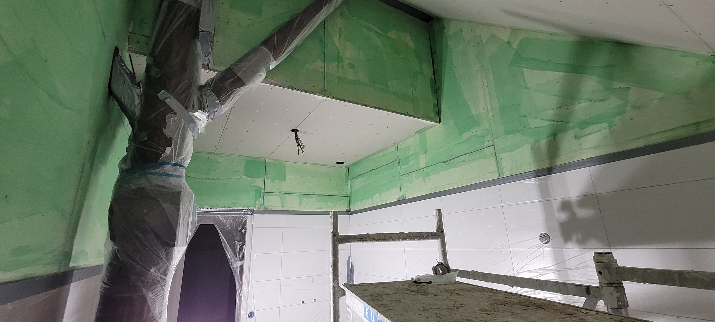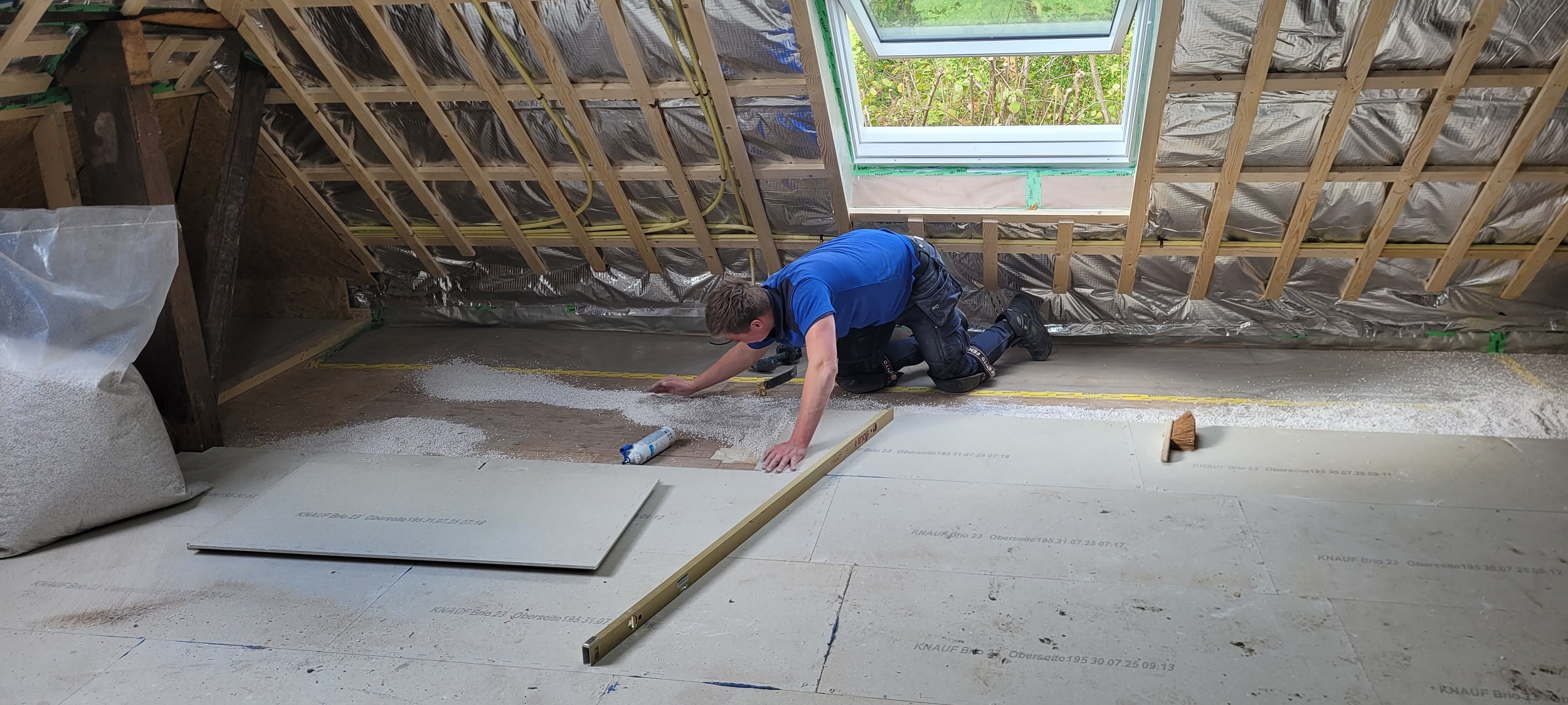 Op de verdiepingsvloer is de vloerverwarming ingefreesd. Sjabbens is bezig met alle elektrapunten, inrichting van de meterkast, aansluiten van de vloerverwarming en de cv-ketel in de technische ruimte. Oosterloo Tegelwerken is begonnen met het tegelen van de wanden in de badkamers en het toilet.