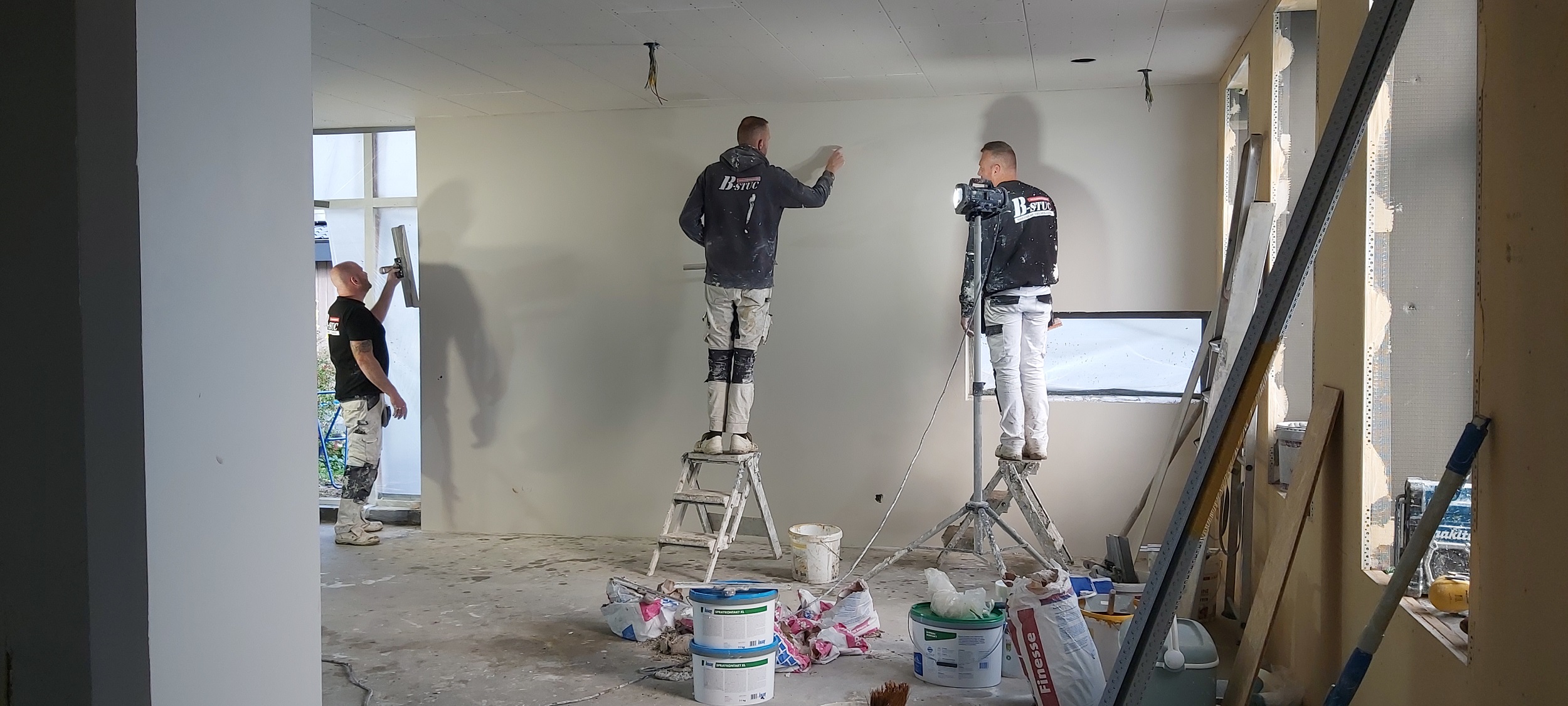 In deze boerderij aan de Dwarsweg in Nijensleek heeft B-stuc uit Noordwolde de wanden klaargemaakt voor renovliesbehang en schilderwerk. Beneden zijn de wanden, plafonds en schuine dakwanden gestuct. Op de verdiepingsvloer zijn alleen de wanden gestuct. De nieuwe en bestaande raamkozijnen, de nieuwe deuren en de stalramen zijn allemaal voorzien van triple glas.