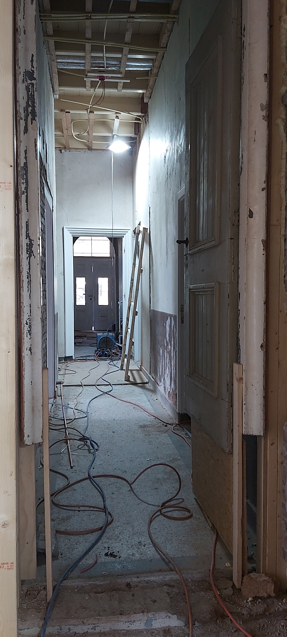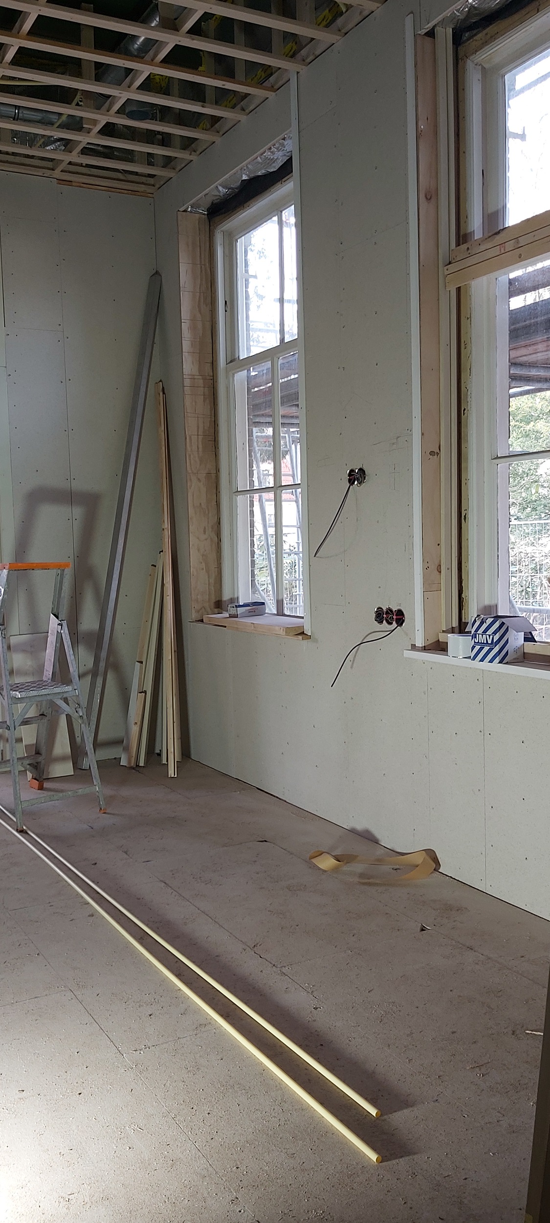 De verbouwing en restauratie van de voormalige tuinbouwschool in Frederiksoord gaat door. In de nieuwe aanbouw aan de achterzijde zijn vier hotelkamers met badkamer. De kamers zijn ruim, en licht dankzij de glazen pui. De indeling van de hotelkamers in het bestaande gebouw is klaar: de binnenwanden staan, zijn geïsoleerd en afgetimmerd met Fermacell gipsvezelplaten. Op de verdieping ligt de vloer er bijna overal in, zodat de vloerverwarming ingefreesd kan worden. Sjabbens is bezig met het trekken van stroomdraden.
