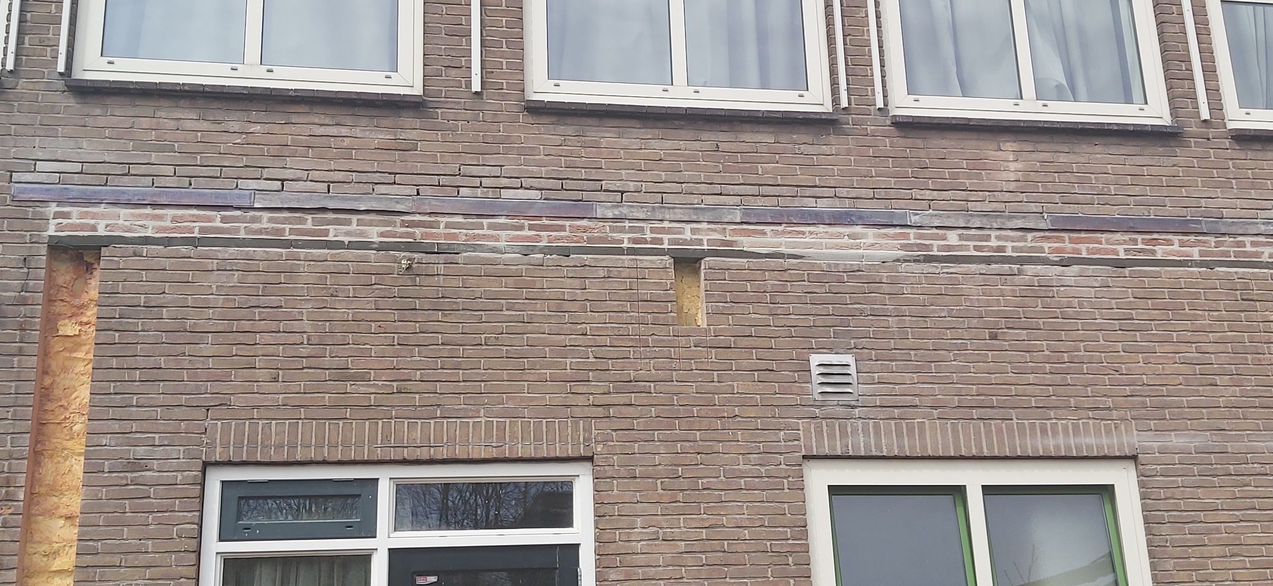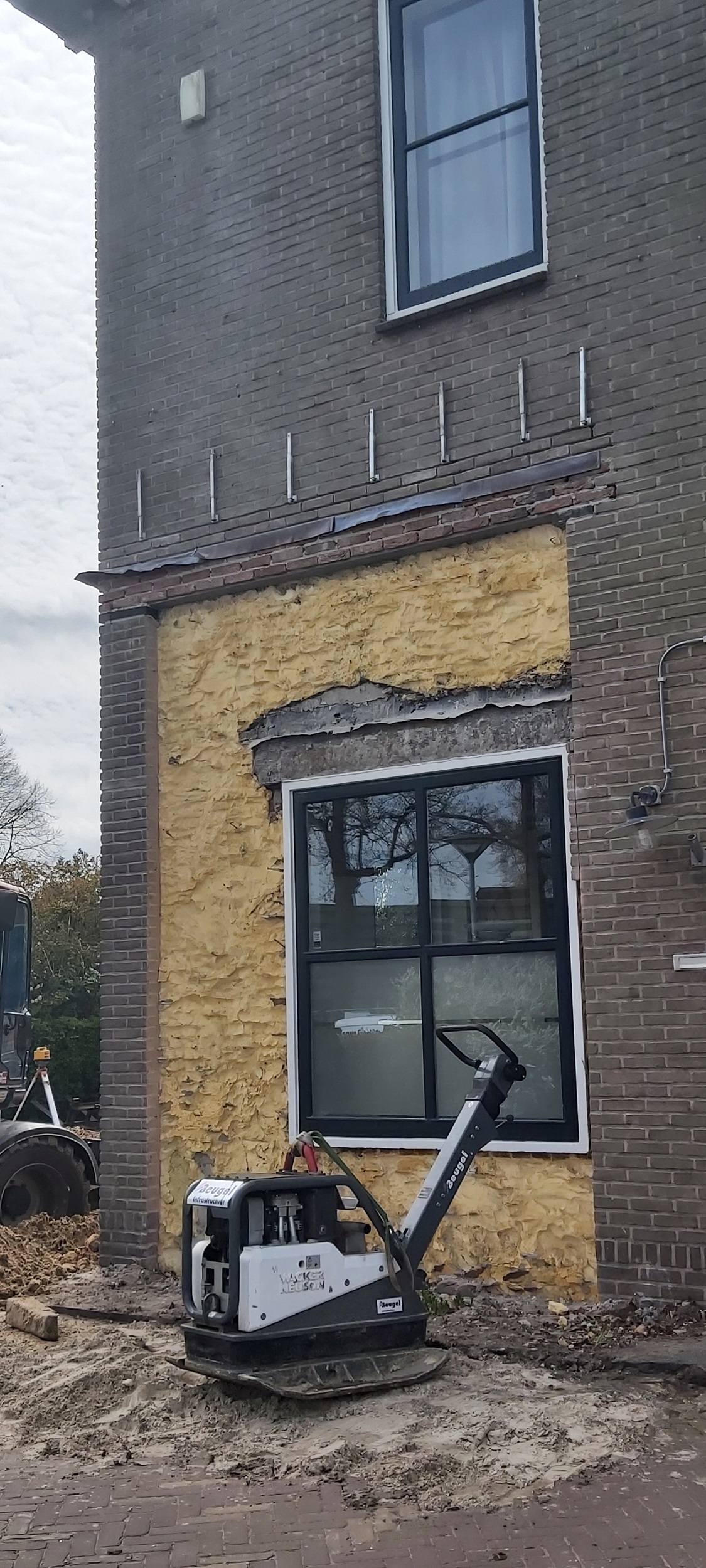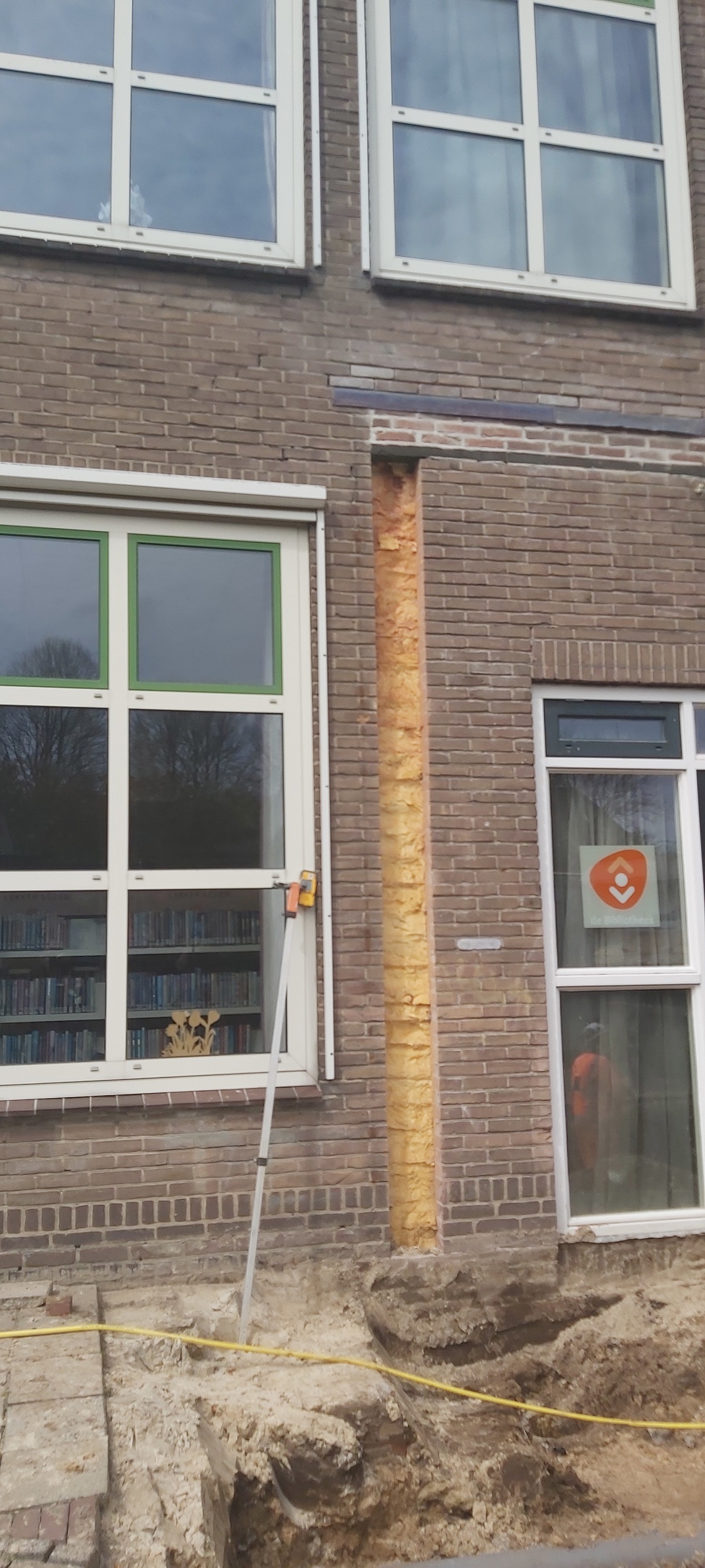 We zijn begonnen met de aanbouw: een grote erker als blikvanger van de voormalige landbouwhuishoudschool. In de erker komen een zithoek en de bibliotheek. Vanwege het broedseizoen zijn we voor 1 april gestart met het hak- en breekwerk in de buitenmuur. We hebben het lood ingebracht in de muur, zodat we de dakbedekking daaronder kunnen werken. Onder de loodrand hebben we een koudebrugonderbreking om te voorkomen dat de warmte en de kou doorstroomt. In de muur maken we een stalen kolom waar het kozijn tegenaan komt. De huidige ramen gaan eruit en vormen dan een doorgang vanuit de binnenruimte. De erker zelf krijgt veel glas.