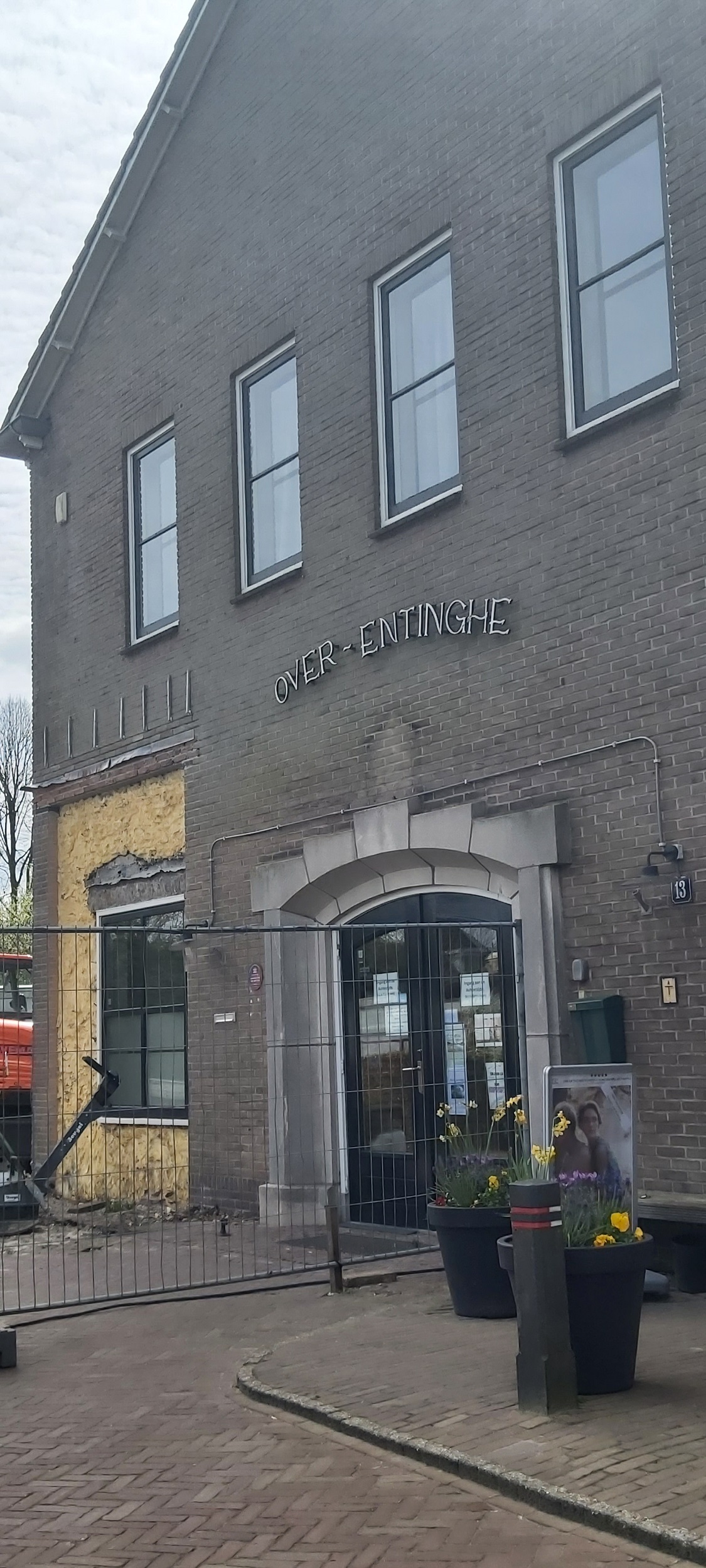 We hebben een start gemaakt met de renovatie en verduurzaming van dorpshuis Over Entinghe in Dwingeloo. In het hele gebouw wordt de oude vloer verwijderd en vervangen door schuimbeton en vloerisolatie. Ook komt er op de begane grond vloerwarming. Binnen komt een nieuwe indeling, muren worden verwijderd om ruimtes te vergroten en er komen stalen balken in. Op de zolder komt een warmte terugwin-installatie (WTW), aangelegd door Sjabbens. Sjabbens gaat alle installatiewerkzaamheden doen.